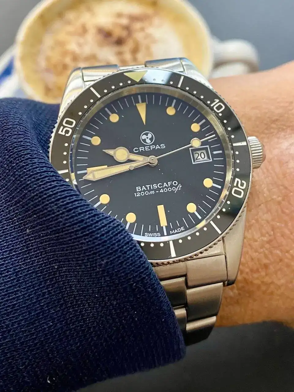 El primero es el Crepas Batiscafo, un reloj que entró el mes de junio del año pasado y al que le acabo de cambiar la esfera original verde por otra negra que me vino cuando la compré. El cambio me ha gustado y me transmite buenas vibraciones cuando lo miro.