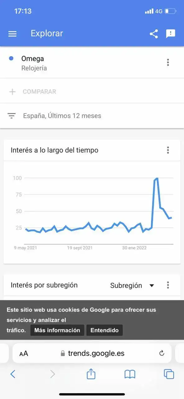 Vuelvo a lo mismo, ¿entonces lo conocen o no lo conocen? ¿en qué quedamos?....porque lo de esgrimir en un mismo post que los que esperan cola por un moonswatch no tienen npi de lo que es un Omega Speedmaster para luego decir que es un diseño atemporal y reconocible y que Omega es un trend..¿ en qué quedamos?...Por ultimo te dejo una búsqueda rápida en google Trends, donde es el número de búsquedas de la palabra “Omega” en los últimos meses…si esto no es buen marketing…