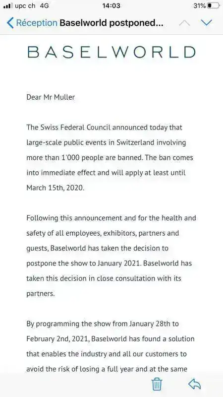 La prohibición aplica hasta el 15 de marzo. Esto pillaba de lleno a Time to Move, del Swatch Group (que se adelantó y canceló hace ya un mes), pero no a W&W (25 de abril) que sin embargo ha cancelado unilateralmente.