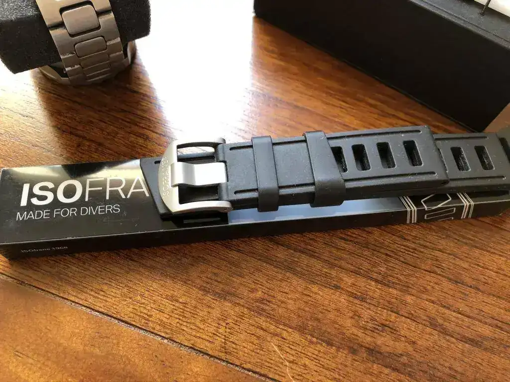 Este modelo está equipado con el armis de acero y, adicionalmente, incluyo en el paquete de venta una correa de caucho de Isofrane, en color negro, que le va como un guante.