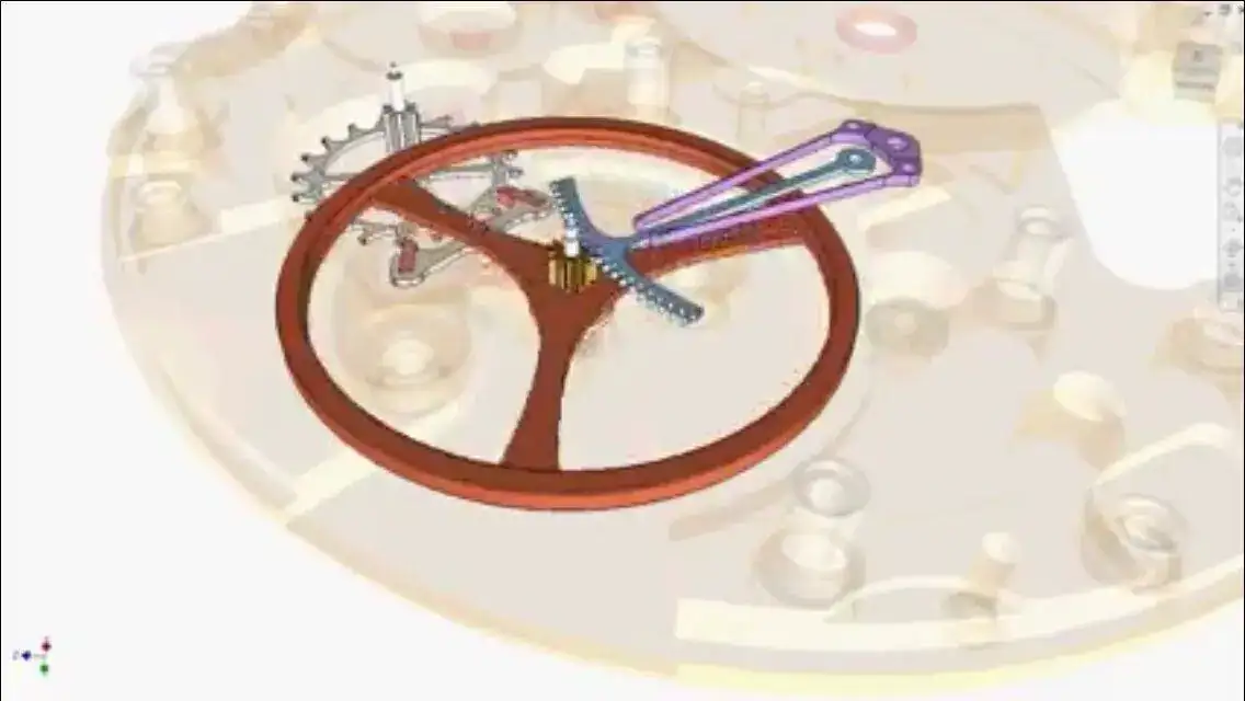 El sistema Calasys consiste, ni mas ni menos, en un volante sin espiral y con doble cañón que oscila sobre un arco dentado y un tenedor que determina su ángulo de oscilación, teniendo así incidencia directa en el ancora.