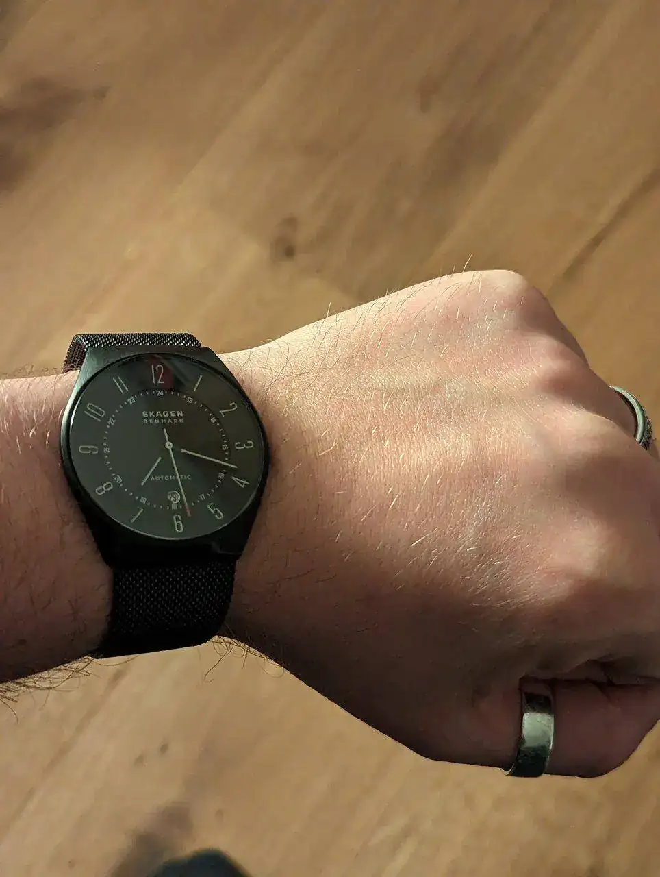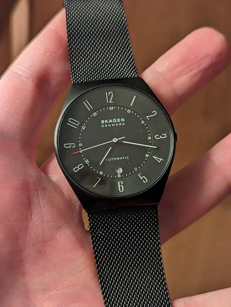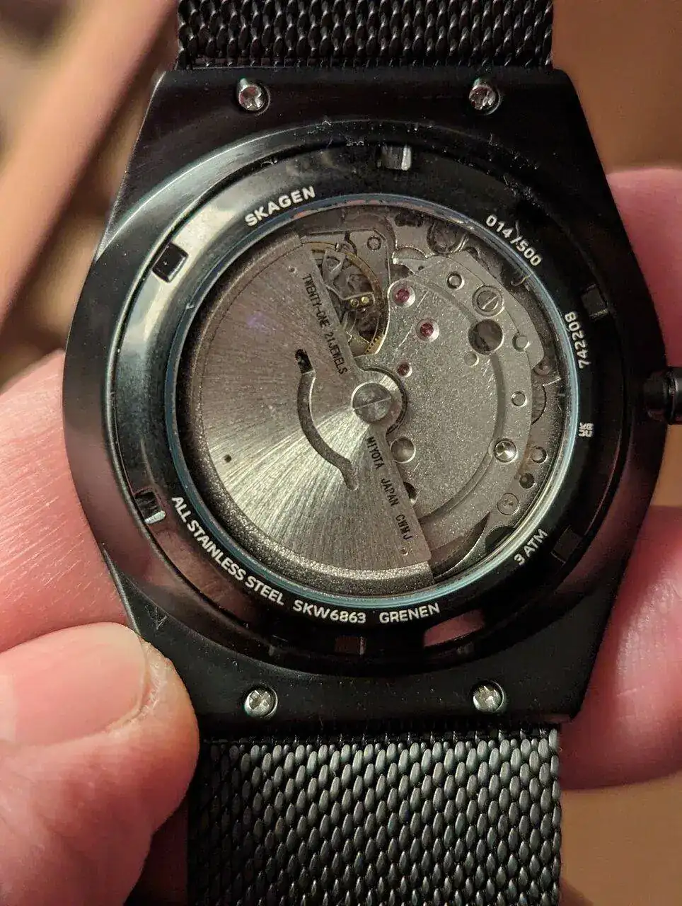 Pero claro, resulta que uno da con un reloj automático de Skagen Denmark (no sé si será el único; desde luego hoy no tienen otro a la venta), que estéticamente está muy chulo y es bastante representativo del diseño danés (con esos números estilo Arne Jacobsen, limpio, súper legible, con una caja característica, manecillas bien largas, etc), con cristal de zafiro, a un precio impresionantemente atractivo, con caja de su acero inoxidable "grenen" (50% reciclado) en un imponente negro, correa de acero preciosa (de lo mejor que he visto en este estilo), números y manecillas reflectantes, y aún por encima serie limitada de 500 unidades (tengo el 14)... Pues es difícil resistirse, incluso con un movimiento Miyota de 21 rubíes a caja vista, e incluso siendo la marca que es - aunque si quieres un reloj danés, es casi de lo más tradicional que te puedes encontrar -.