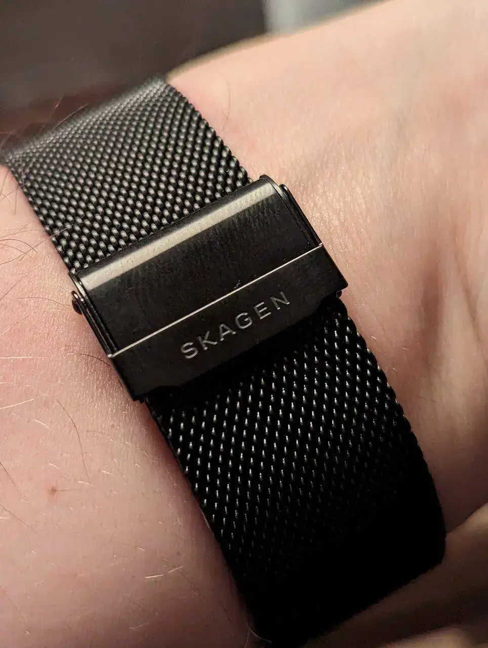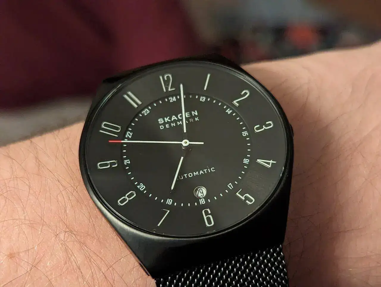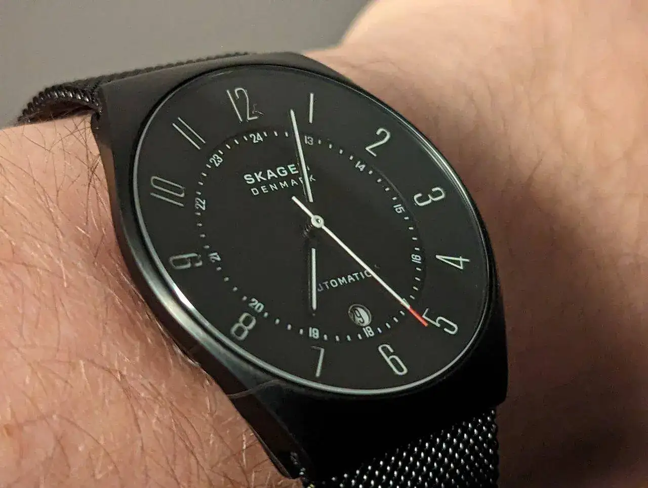 Pero claro, resulta que uno da con un reloj automático de Skagen Denmark (no sé si será el único; desde luego hoy no tienen otro a la venta), que estéticamente está muy chulo y es bastante representativo del diseño danés (con esos números estilo Arne Jacobsen, limpio, súper legible, con una caja característica, manecillas bien largas, etc), con cristal de zafiro, a un precio impresionantemente atractivo, con caja de su acero inoxidable "grenen" (50% reciclado) en un imponente negro, correa de acero preciosa (de lo mejor que he visto en este estilo), números y manecillas reflectantes, y aún por encima serie limitada de 500 unidades (tengo el 14)... Pues es difícil resistirse, incluso con un movimiento Miyota de 21 rubíes a caja vista, e incluso siendo la marca que es - aunque si quieres un reloj danés, es casi de lo más tradicional que te puedes encontrar -.