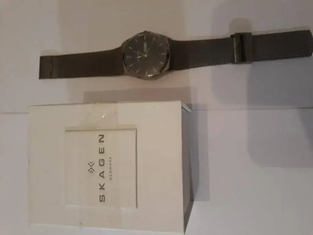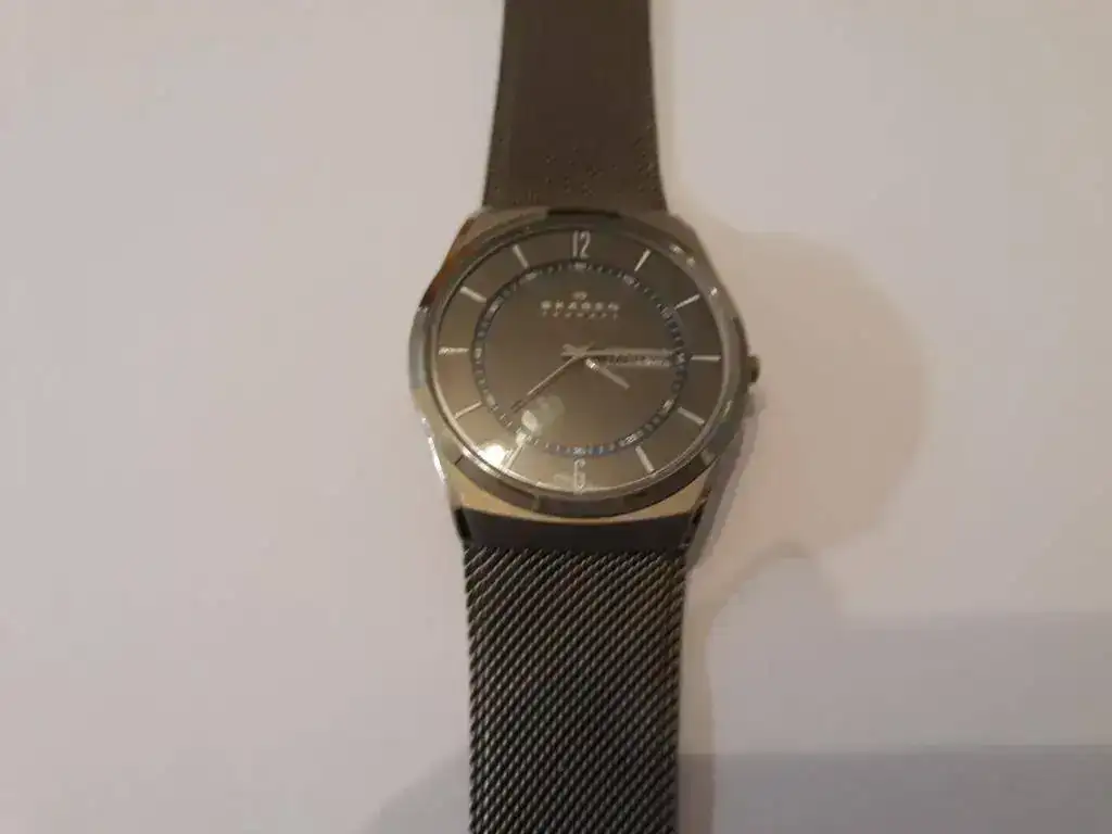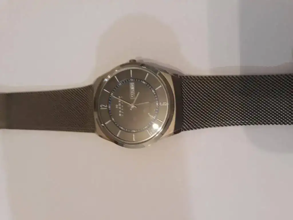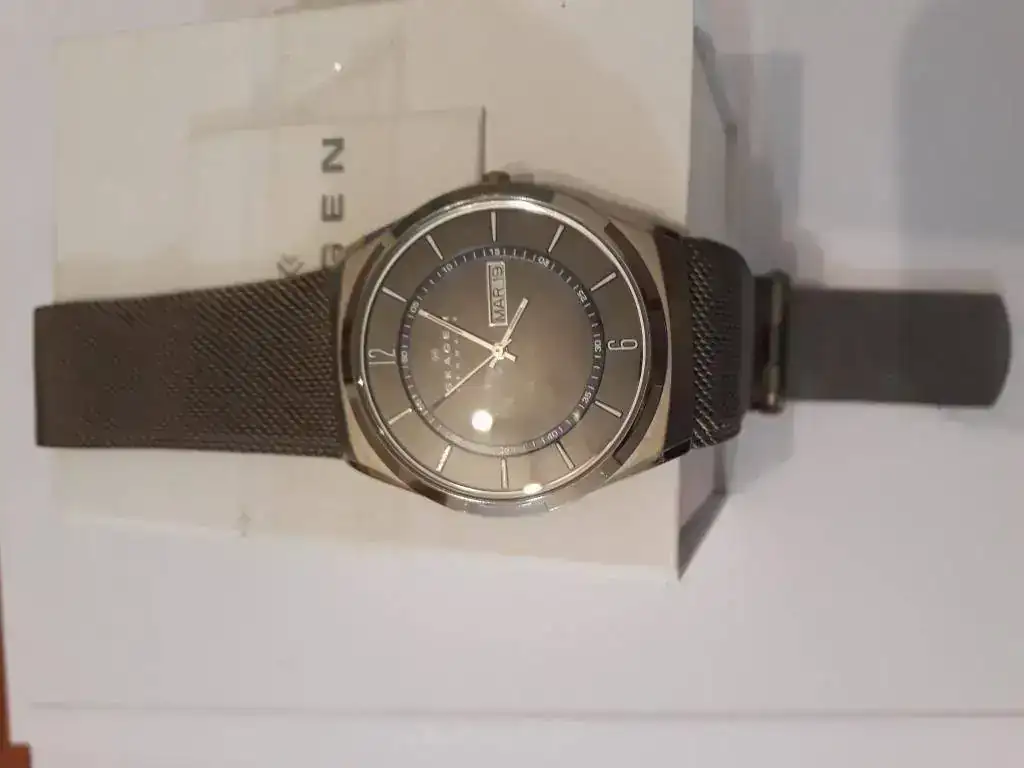 Vendo reloj Skagen (marca danesa) extraplano de titanio en perfecto estado de uso y conservación, funcionando perfectamente. Caja de titanio de 40 mm de diámetro en acabado mate pulido. Sumergible 5 atm. Brazalete de malla de titanio, tipo milanesa muy bonita. Reloj muy ligero y cómodo de llevar. Esfera gris con motivo azul, índices cromados y números árabes a las 6 y 12. Dispone de indicador del día y fecha. Agujas luminiscentes. Cristal mineral endurecido. Vendo en su caja original y a mitad de su precio original.