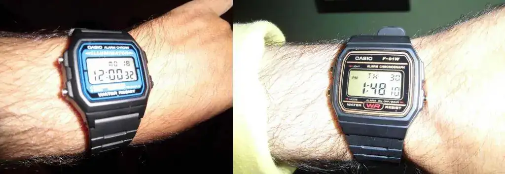 3. Iluminador: Esta seria la principal diferencia, el F105W tiene una muy bonita luz aguamarina que ilumina toda la pantalla, la legibilidad de noche es mayor, y realmente se nota la diferencia al comparar con la luz verde del F91W, sin embargo la luz del F91W me sigue pareciendo agradable, aunque la forma que ilumina es mas floja, incluso llevando pila nueva.