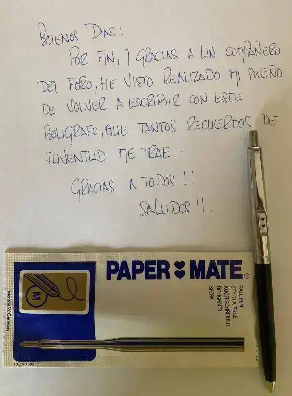 A mí lo que me pasa con ese modelo de boli es que cada vez que veo ejemplares viejos en mercadillos a precio de derribo, compro todos los que pillo. Me gusta su forma delgada, su clip largo fuerte y alto, y el hecho de que esté el boli en el estado que esté, esas minas PaperMate, tengan los años que tengan, casi siempre andan escribiendo como el primer día. (Como referencia, los Parker viejos que veo con mina original, la mayoría de las veces no escriben, a veces reviven con un calentón de mechero, a veces ni eso. Los Paper mate casi siempre arrancan).