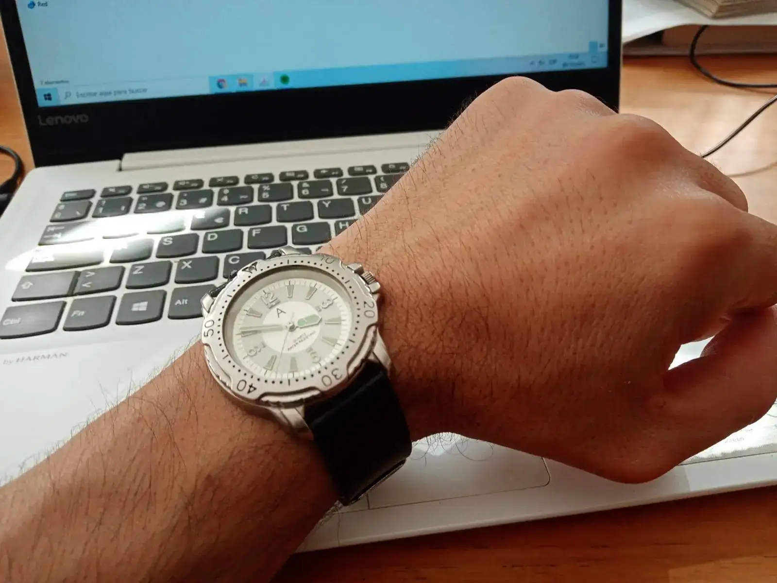 Con algo de "luminova" que aún tenue, funciona, provisto de un bisel giratorio unidireccional de un sonido de clic que no está mal del todo, y demostrando, aún sin "caché" que sigue haciendo aquello para lo que fue construido, medir tiempo, para mí se ganó la posibilidad de formar parte del foro, y aprovecharlo para invitaros a mostrar también vuestras primeras máquinas de tiempo.