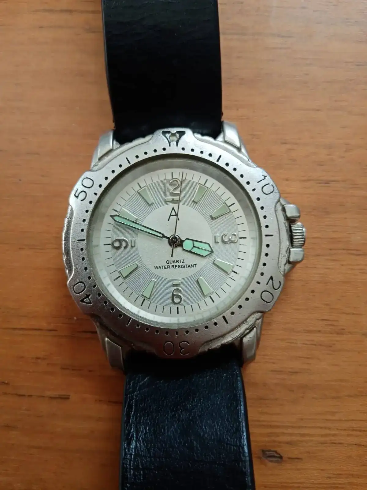 Hace un par de meses, buscando entre mis cosas apareció el reloj de las fotos que os comparto (aunque sin la correa). Ni siquiera recuerdo bien su procedencia, creo que algún regalo humilde de cumpleaños o de comunión, de marca "A", Water Resistent, de cuarzo, que desconozco; un reloj barato, de maquinaria china, y sin ningún interés relojero. Sin embargo, al verlo, rápidamente quise abrirlo, ver su estado, comprar una pila, y, con los dedos cruzados, probar a ver si andaba. El relojero, además de la pila, le puso la goma de "estanqueidad", y !funcionó!