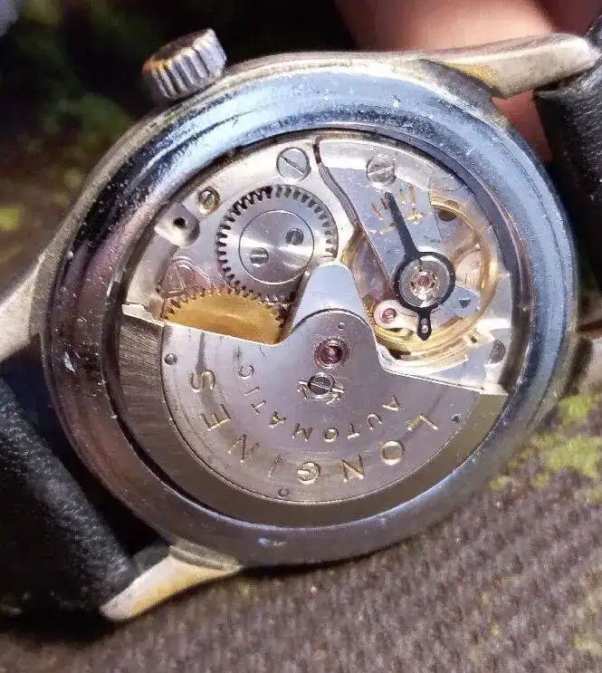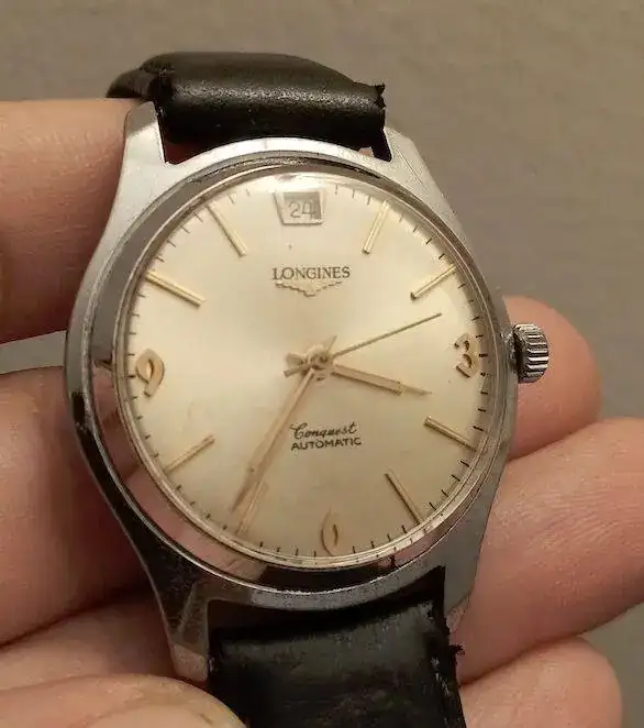 Este es el reloj de mi abuelo. Lo mandé restaurar lo más que se pudo. Lo revivieron y ahora funciona correctamente, pero pedí no tocar el dial, aunque se nota que sufrió humedad en su día. Quizás eso fue la causa de otra cosa de la que me di cuenta con el tiempo: El logo está probablemente repintado, y además buscando en internet no he encontré una versiòn cincuentera o sesentara con un Conquest con esos numerales. Además tengo sospechas respecto a la caja, inclusive. Pero bueno, me encanta igual. El calibre creo que es el 291 y anda perfecto. Sé, porque me dijo mi abuela, que se lo compró nuevo con un bono que le dieron en el curro, jeje. Quién sabe cómo lo jodió tanto y la pasta que se gastó en arreglarlo.