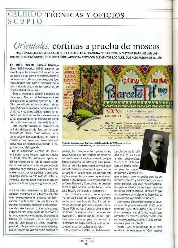Lo cierto es que Vicente Barceló Santonja era un alicantino emprendedor, valiente y ambicioso, que patentó las cortinas de sarmientos y su modo de elaboración y de pintado, y que en 1916 abrió junto con sus hermanos en Sax, Alicante, una empresa que llegó a alcanzar los 100 empleados, dedicada en exclusiva a la fabricación de cortinas elaboradas con finos sarmientos de vid, pintadas a mano, y llamadas con el nombre de orientales. Más tarde serían conocidas como alicantinas.