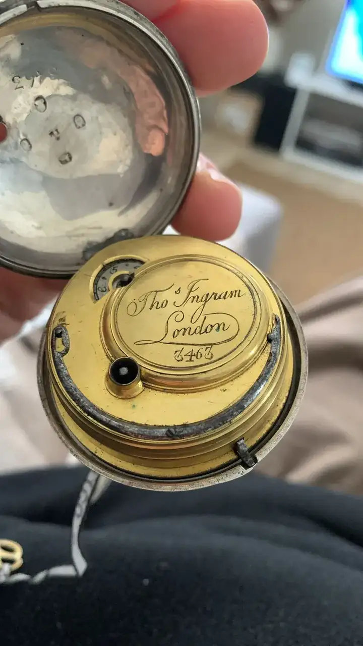 Sobre este Thomas Ingram en concreto no he encontrado ninguna referencia directa en una búsqueda rápida. Si hay otro TI como miembro de la asociación de relojeros en 1695 y otro William Ingram en 1730, que quizás fuesen parientes. Has de tener en cuenta, que la mayoría de las veces el nombre que aparece no pertenece a ningún relojero, sino al joyero que lo vendió.Adjunto las fotografías que me solicitó, por si pudieran ser de ayuda para averiguar algo sobre el relojero (Thom. Ingram, que figura grabado en la caja) y también sobre esas iniciales ( IM ó LM??) que podrían ser del platero constructor de la misma.