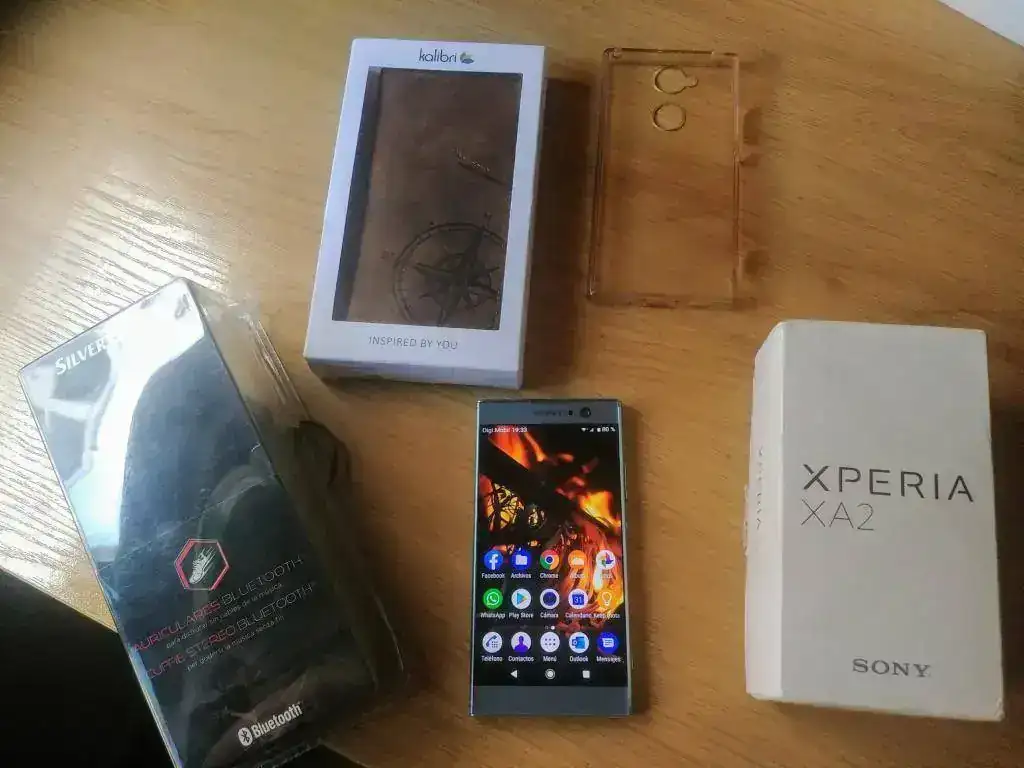 Sony Xperia XA2 nuevo, sin nada, se entrega con su factura y su consiguiente garantía en su caja, con dos fundas como se ve en las fotos, una de piel tipo libro preciosa, que le queda como un guante, accesorios sin usar, y unos auriculares bluetooh con recambio.