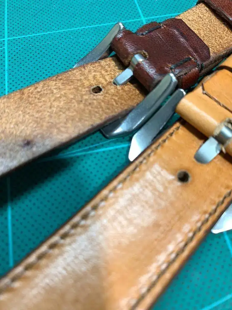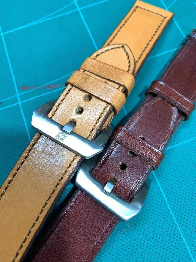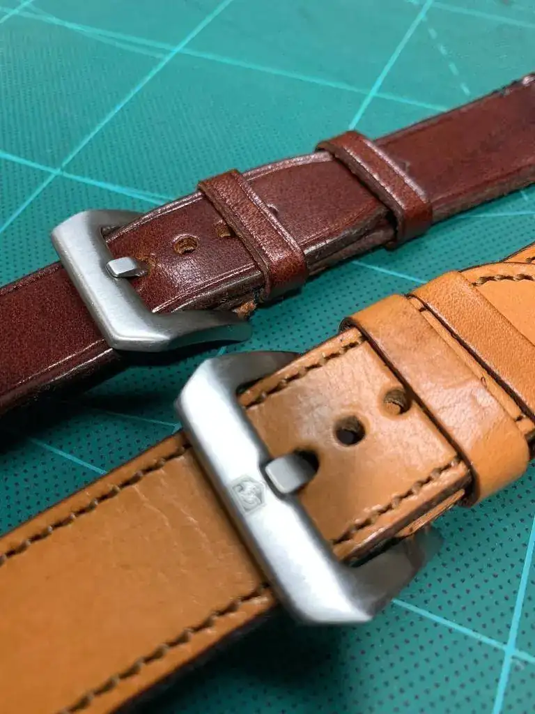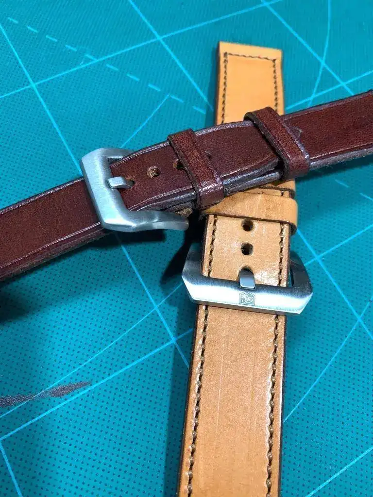 Así que le propuse, ya que son cueros de primera calidad que si con esos retales me haría correas para mis relojes y me dijo que sí, compré varias hebillas, al ser novato he fallado un poco y todas eran demasiado grandes para mi gusto, pero bueno ahí están y se irán usando y hoy me ha dado dos, ambas son de 24mm, la oscura acaba en hebilla de 22mm y la clara es recta y acaba en 24mm.