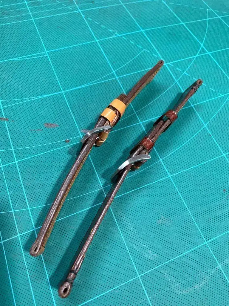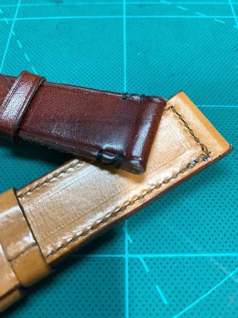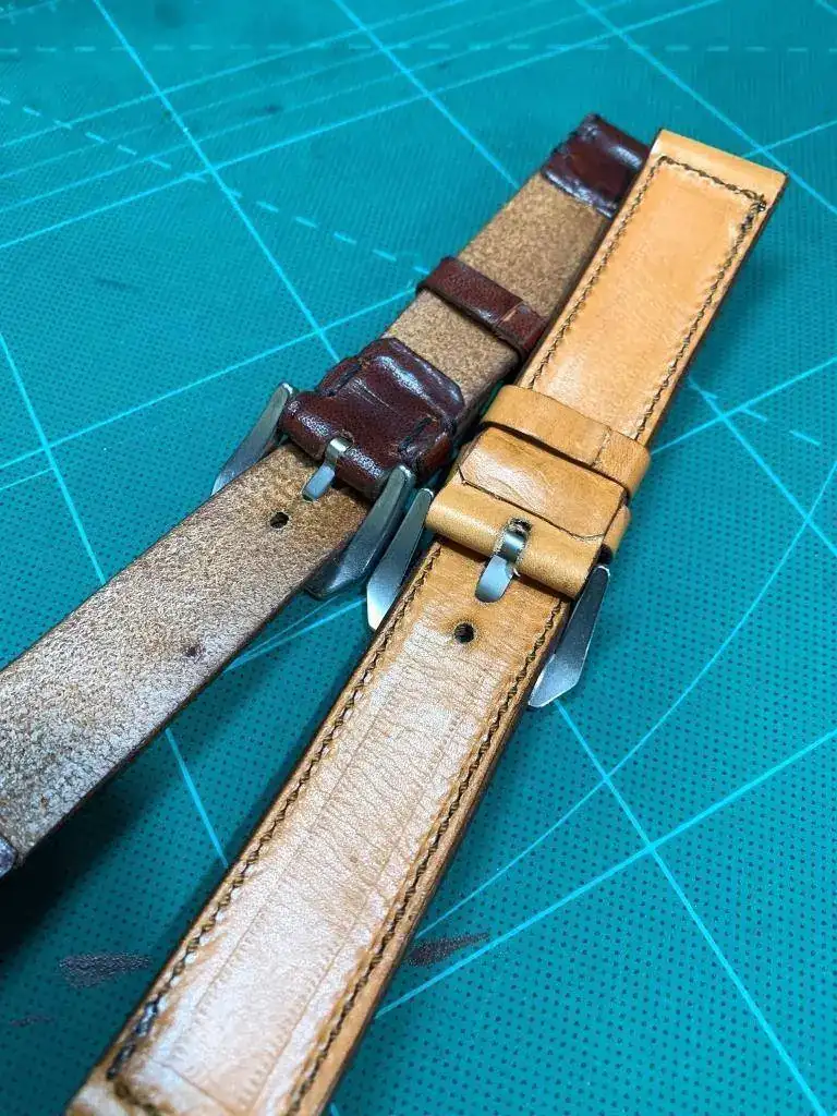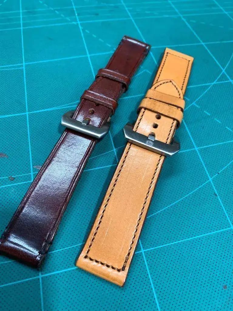 Así que le propuse, ya que son cueros de primera calidad que si con esos retales me haría correas para mis relojes y me dijo que sí, compré varias hebillas, al ser novato he fallado un poco y todas eran demasiado grandes para mi gusto, pero bueno ahí están y se irán usando y hoy me ha dado dos, ambas son de 24mm, la oscura acaba en hebilla de 22mm y la clara es recta y acaba en 24mm.