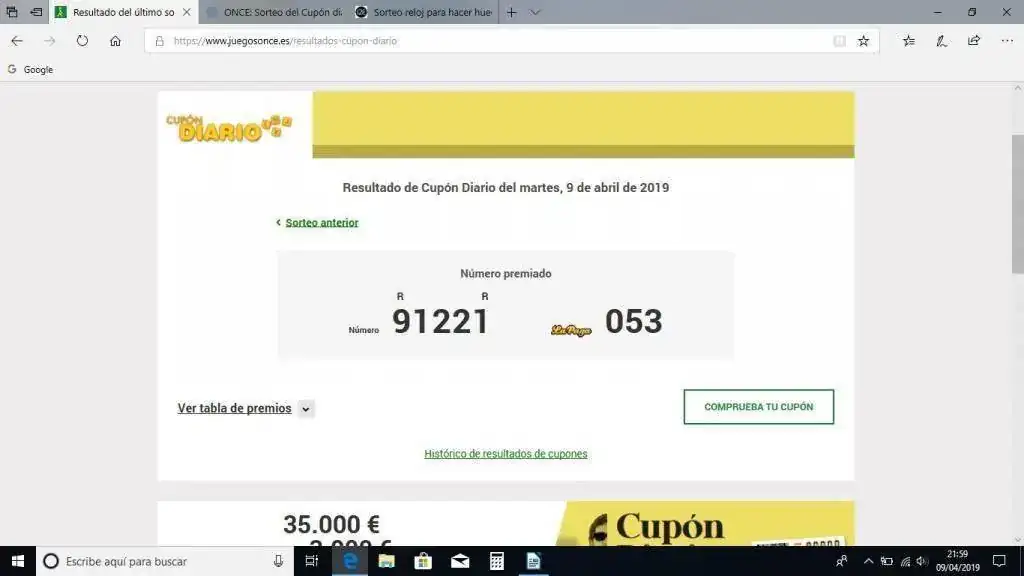 El número premiado en el sorteo del Cupón Diario de la ONCE del 9 de Abril de 2019 es el: 91221