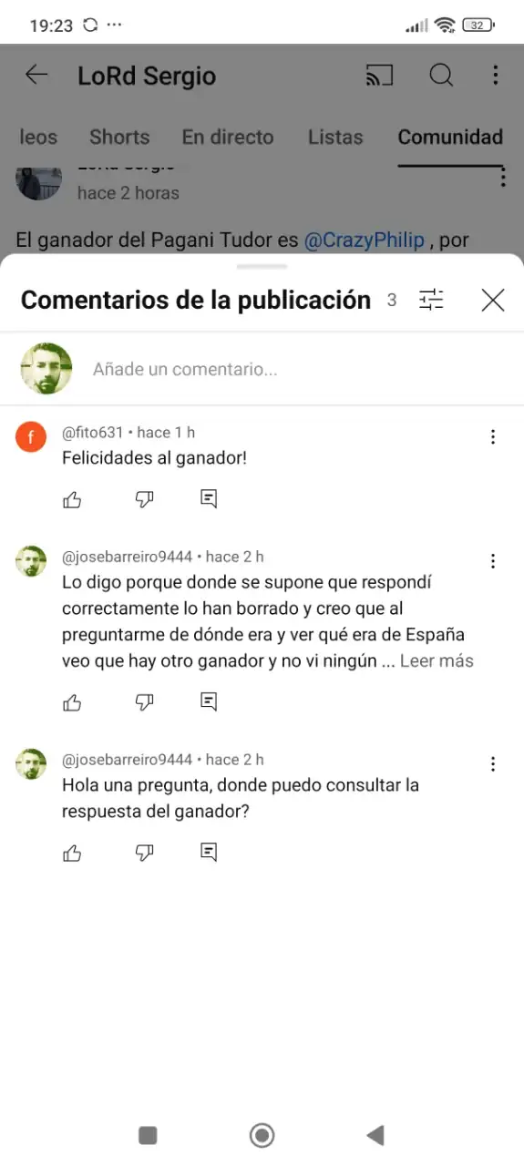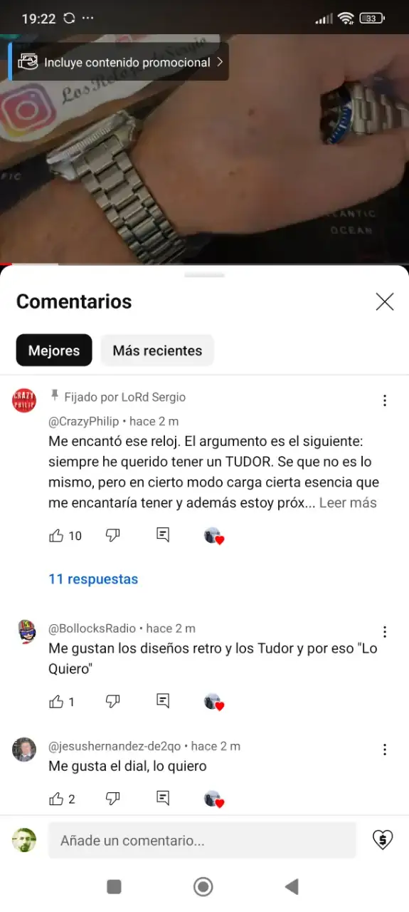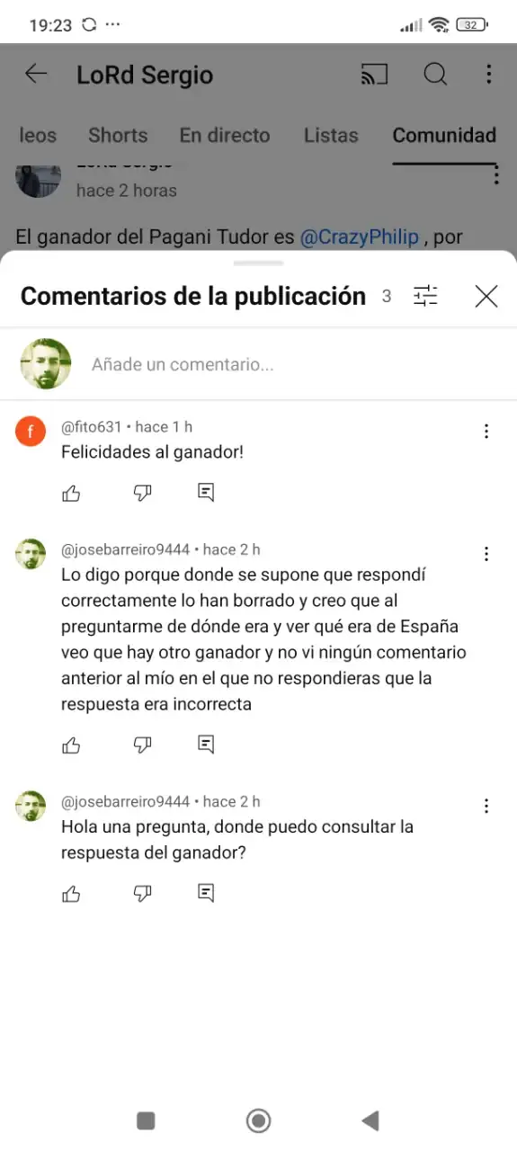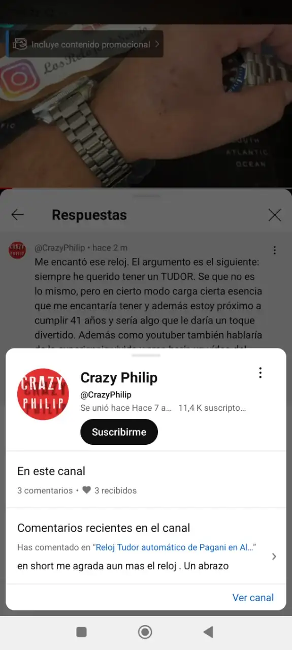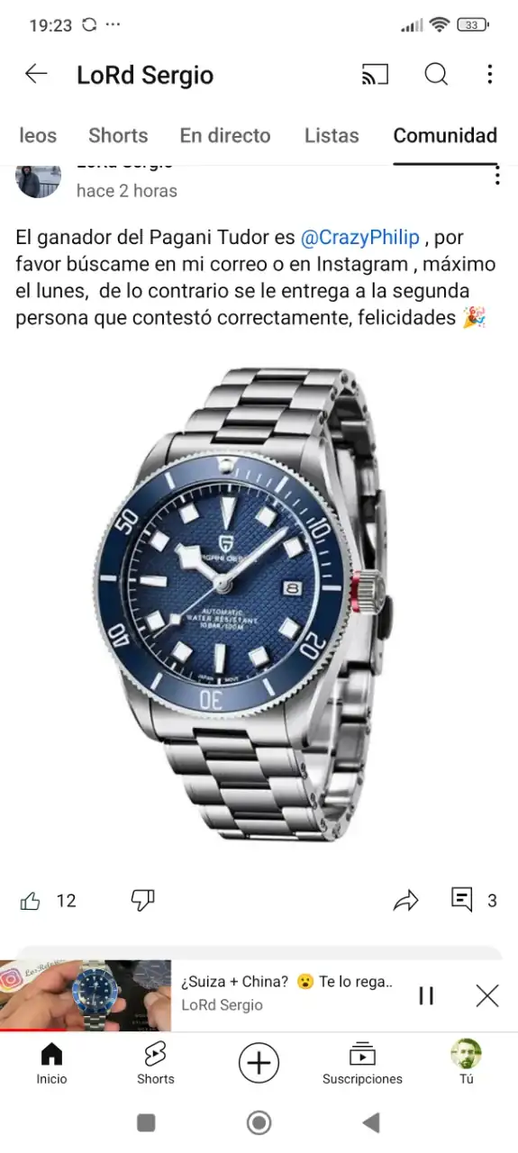 Buenas tardes, pues os voy a relatar lo que me ha pasado con este Youtuber y después espero vuestras opiniones. Ayer estaba aburrido y me dio por ver Youtube, normalmente veo canales de relojes o de tutoriales, entre medias me sale una notificación de Los relojes de Sergio, un canal que me parecía entretenido y serio en cuanto a funcionamiento, digo parecía porque lo que me ha pasado ha sido un poco surrealista o cómico por decirlo de alguna manera. El asunto en cuestión es que este señor sorteaba un Pagani inspirado en un Tudor, requisitos poner en comentarios una frase que terminase en "lo quiero" y que entrábamos en el sorteo cuando el vídeo tuviera 2000 visitas, bien pues una vez se cumplen éstas 2000 visitas, mi sorpresa es que me llega una notificación y pone el primero que conteste en que video de todo mi canal empiezo a decir Los relojes de Sergio se lleva el reloj, bien soy de los primeros en contestar y veo que después de varios nos a otras respuestas me dice, José de donde eres? (Había acertado y fui el primero en dar la respuesta correcta, así que uno+uno son dos) Le respondí que de Coruña España, pasa una hora y mi sorpresa es que asumo que soy el primero por orden de comentarios en acertar, la verdad es que sorprendentemente tuvo poca participación, veo al rato que el ganador es un youtuber tambien que no había ni contestado en la encuesta, veo que el enlace de las preguntas y respuestas se ha eliminado, digo oye me puedes explicar cómo ha ganado este señor si no estuvo en la encuesta ningún comentario de el? Y ahora veo que has fijado un comentario de el con calzador hace un rato donde te hacía la pelota... No se me parece de risa y a la vez me ha molestado porque si dice el sorteo es solo para gente de Sudamérica ya ni me molesto en participar, pero es que no tiene la excusa de me tienes que seguir en Instagram y YouTube como hacen otros porque le sigo en los dos sitios y el me seguía en Instagram, no sé su actitud me ha decepcionado y veo que solo buscan seguidores con los sorteos para después dárselo a quien les da la gana, os ha pasado esto alguna vez?