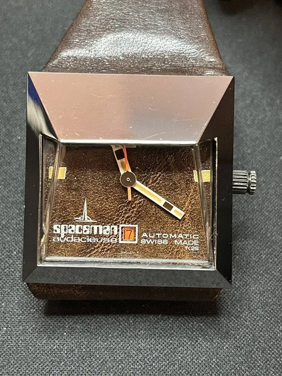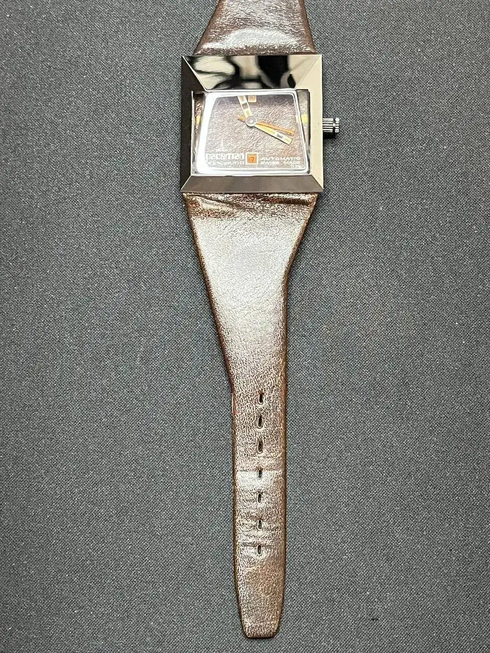 Hubieron de cuarzo, y automáticos con posibilidad de cuerda manual. También los diferentes y atrevidos colores del dial, como blanco, negro, azul, cromado, etc… pero el más curioso, este con el dial de mismo material que la correa (original) de piel marrón brillo. Parece que la correa atraviese por medio del dial.