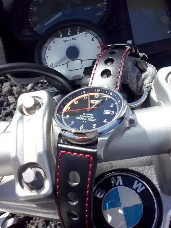 Correa nueva a estrenar de piel negra con costuras en rojo tipo Rallye apropiada para el carácter del reloj.