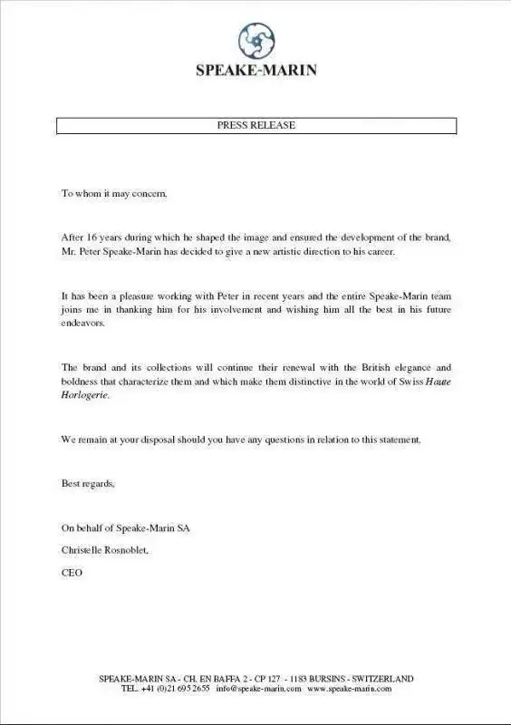 Fue en el año 2008 (inicio de la crisis) cuando Speake-Marin empezó a ceder partes cada vez mayores de su empresa. Últimamente la directiva (de la que no formaba ya parte) había decidido hacer relojes más accesibles, con calibres ETA (cuando lo más "normal" que había hecho el propio Peter fue poner calibres Vaucher a sus Velsheda) y parece que ese ha sido el final del recorrido. Parece que se reproduce el tópico acerca de que un buen artesano no tiene por qué ser (y generalmente no es) un buen empresario.