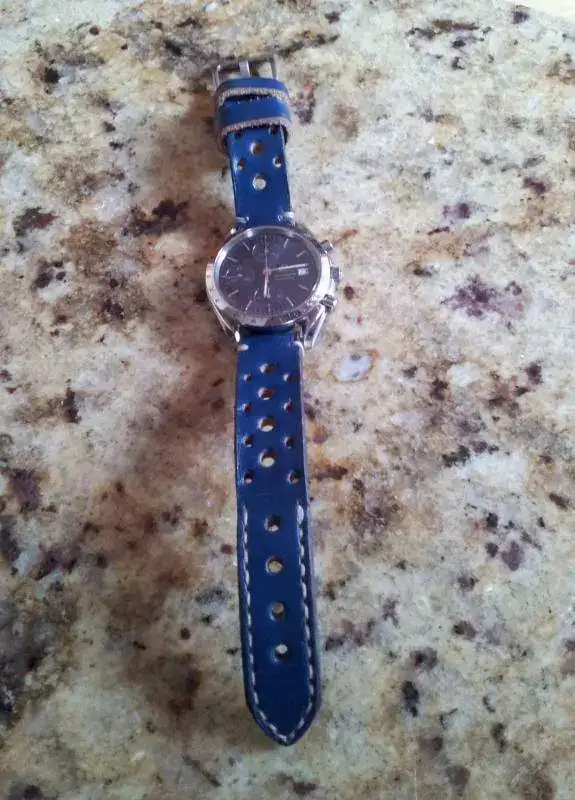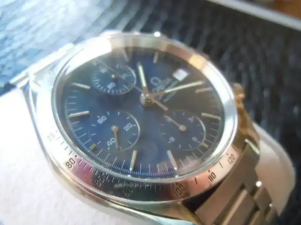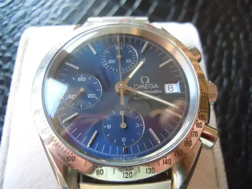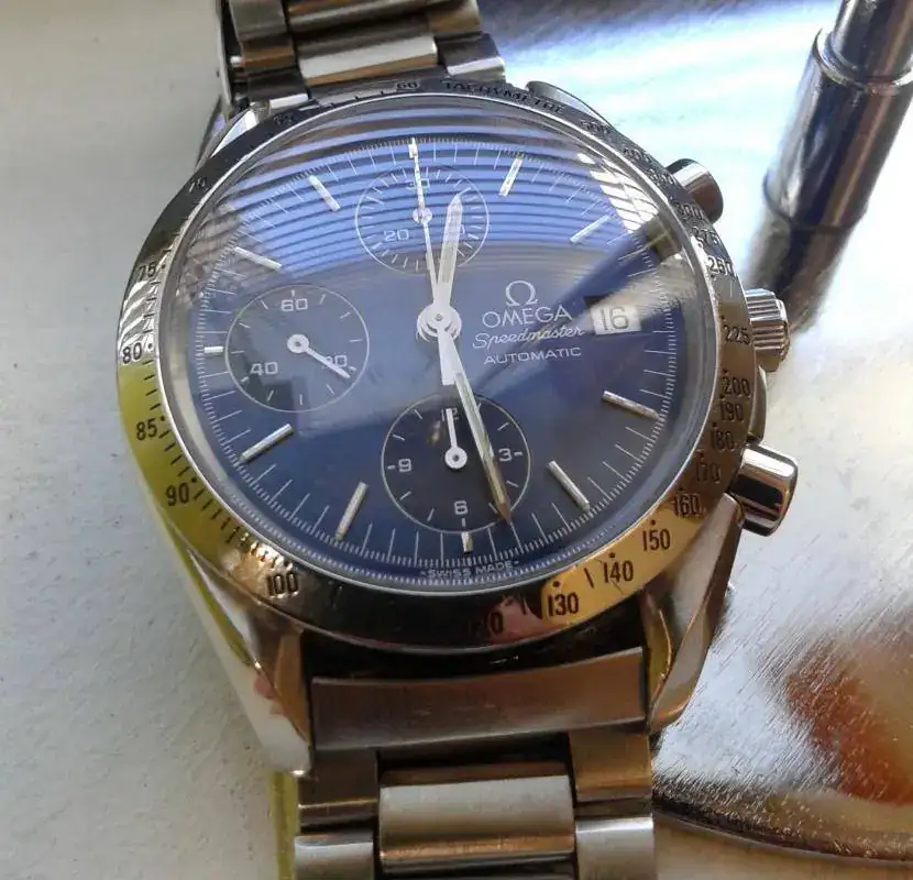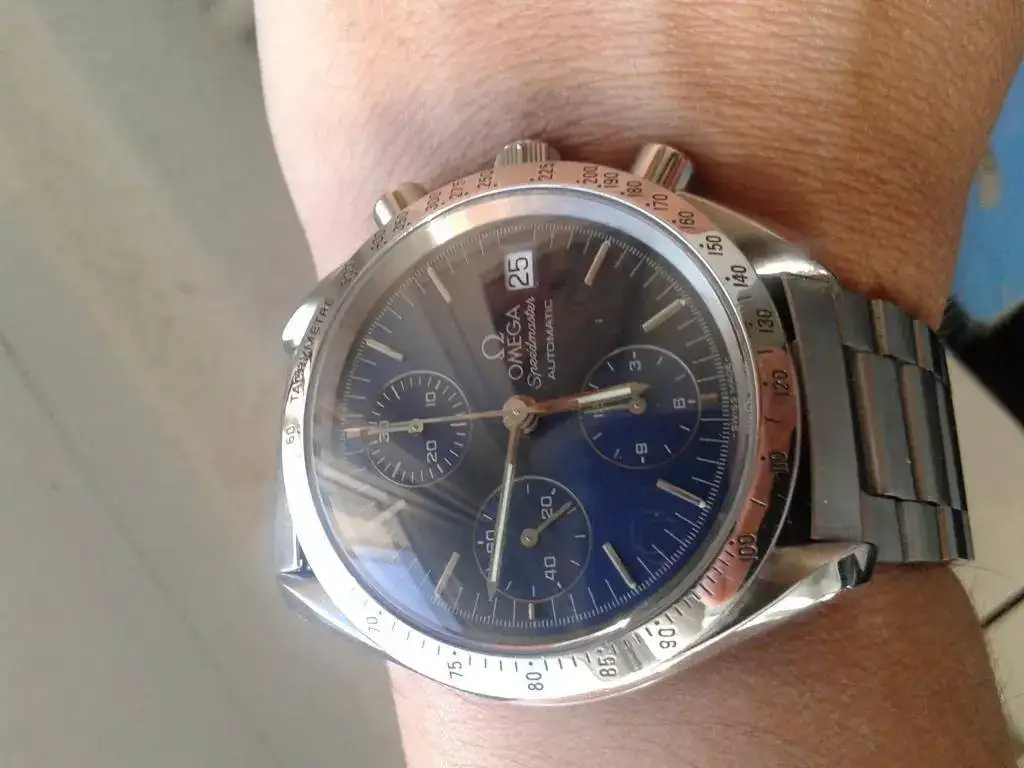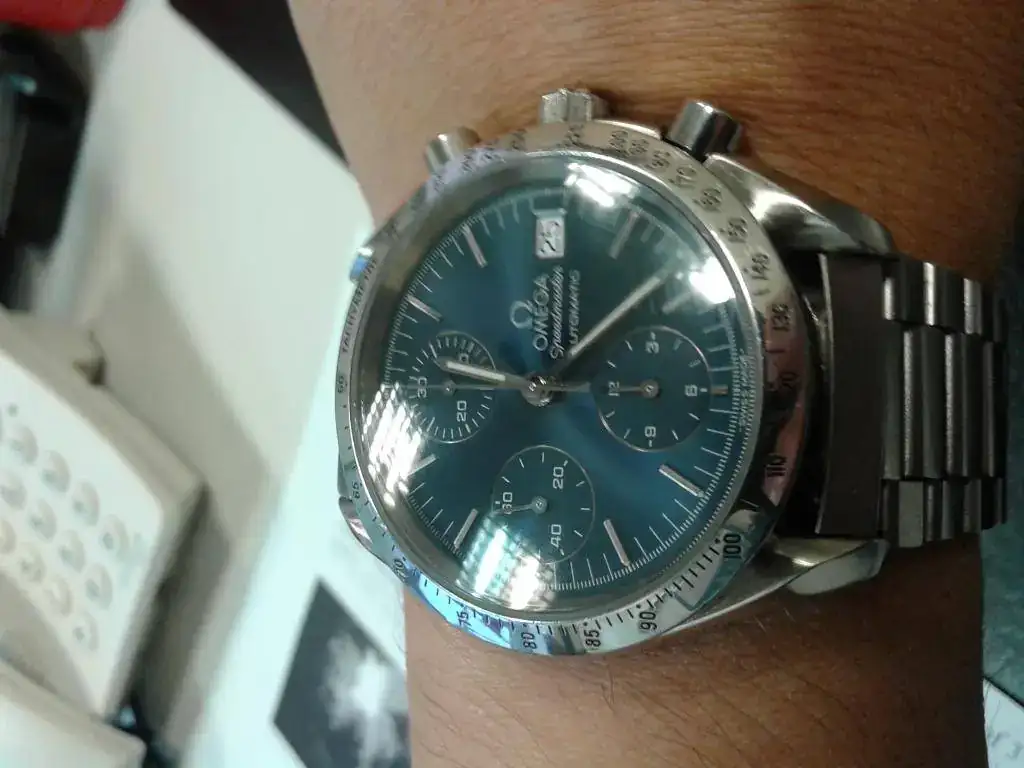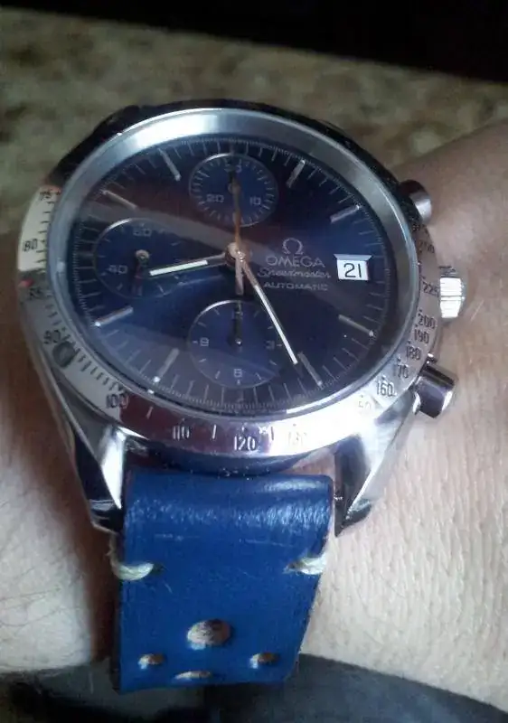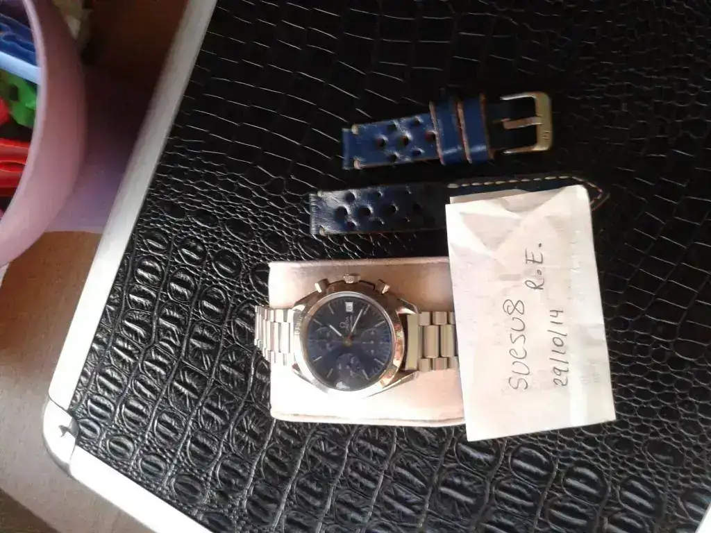 Pues aún con dudas saco a la venta mi Speedy date, pero ahora uso mucho más el Mark, y le ha tocado. Lo adquirí sin caja ni papeles, a un reputado forero. Es un modelo del 97, muy poco visto con esta preciosa esfera azul, que adopta diferentes tonalidades a la luz del sol. Las fotos son muy malas, pero no me salen mejor. Priorizo el trato en mano en Madrid para que veas el reloj. Lo compré sin armis, traía una hirsch carbón azul que le quedaba fenomenal, pero se desgastó mucho y la cambié. Lo entrego con una correa artesana que aparece en las fotos con mucha vida aún y con un armis vintage original omega que he adquirido recientemente para él en muy buen estado que le queda estupendo, peeeeero no es el suyo de origen, si no se aprecia bien en las fotos mando más por whatssapp, que esto quiero que quede bien claro, sobre todo por los end links, fijaos bien en las fotos (el de abajo esta tal cual y al superior el relojero le limó una esquinita ligeramente para que encajase bien). La caja está en muy buen estado y el zafiro impoluto, no aparenta su edad. No sé los segundos de desvio diario porque no tengo cronocomparador, pero mantiene bien la marcha y crono perfecto. Yo nunca lo he abierto ni conozco cuando se le hizo la última revisión, por lo que seguro le vendría bien una, pero el reloj marcha bien. No regateos por favor, no voy a bajar el precio que creo que está muy bien, el primero que llegue se lo queda. Muchas gracias por leer y a R.E. por la oportunidad.