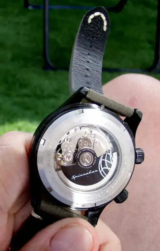 La trasera es vista, ofreciendo su máquina NH35, con un bonito rotor negro y grabado a laser.