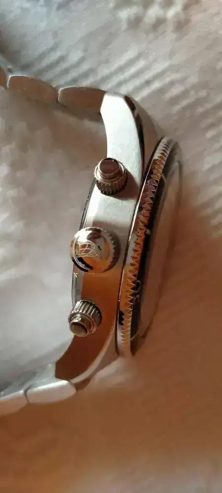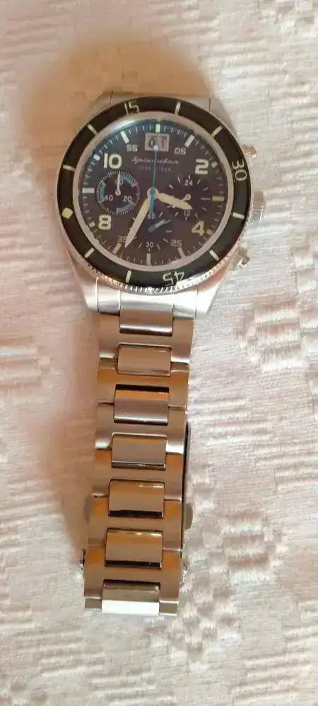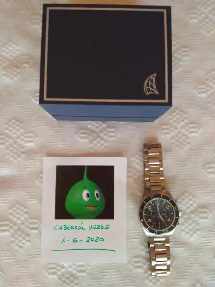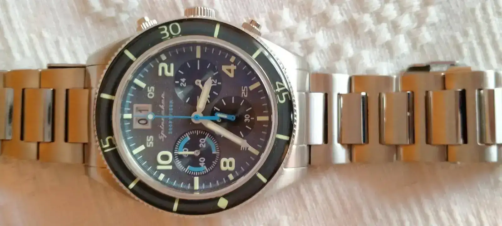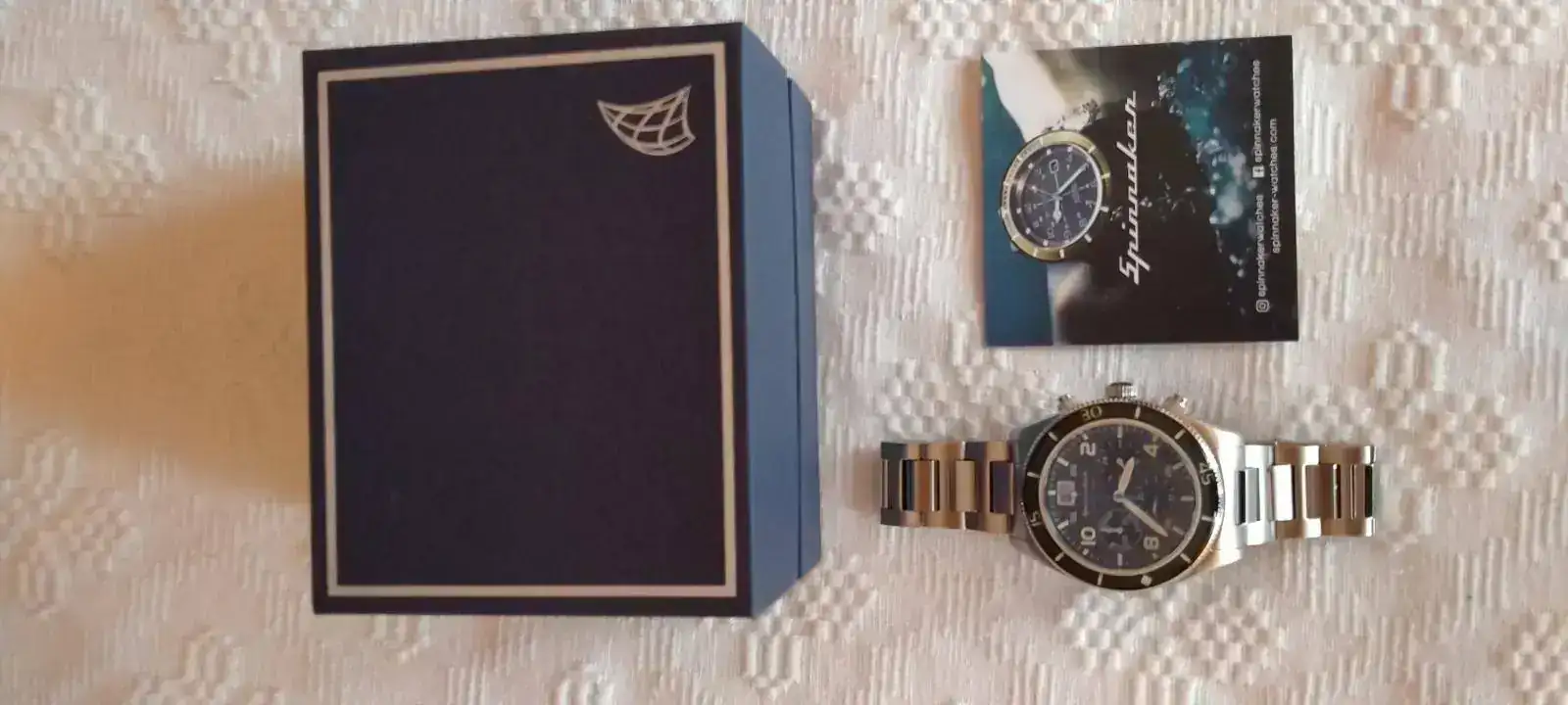 Recién llegado del lejano Oriente, pongo a la venta este Spinnaker Fleuss Crono de nueva hornada, en estado impoluto (ni una puesta; solo probado en muñeca) Fruto de una CRI habitual en nuestra afición me decidí a comprar este crono, y una vez llegado, lo veo contundente para mí (los gustos han ido cambiando con el paso del tiempo, y cada vez los prefiero más contenidos) La verdad es que no es una paellera, ni mucho menos, y es muy ponible en todo tipo de muñecas. Sus principales características son: