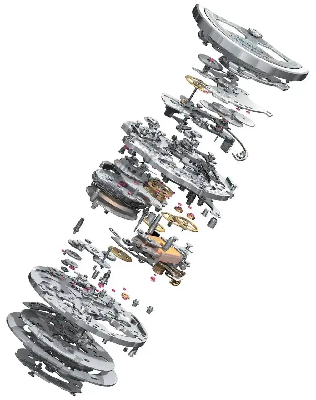 Pues bien, un calibre 9R86 tiene 416 piezas, de las cuales 3 no son mecanicas(tri-synchro).