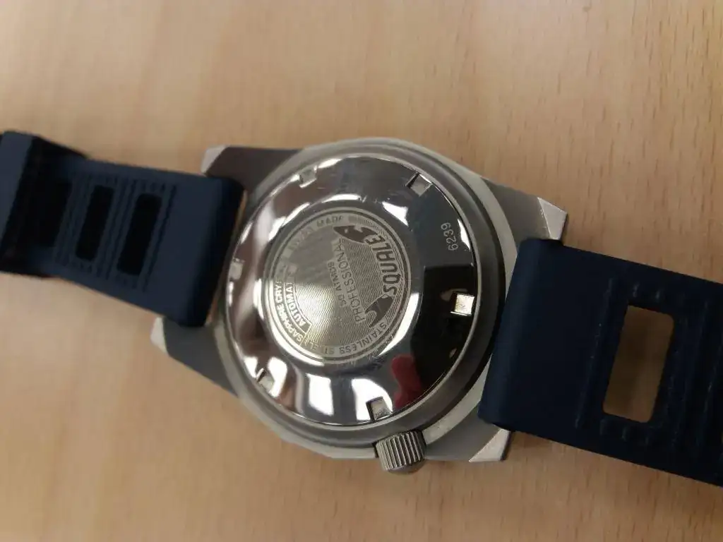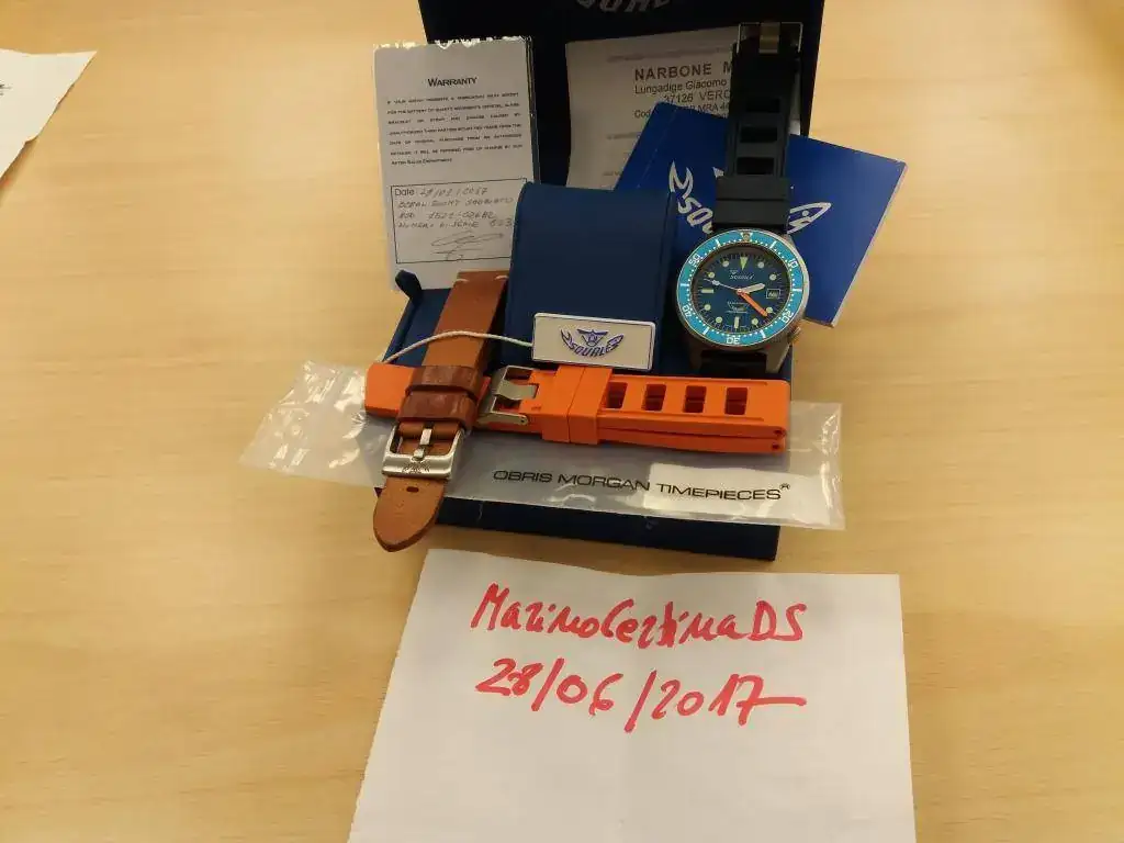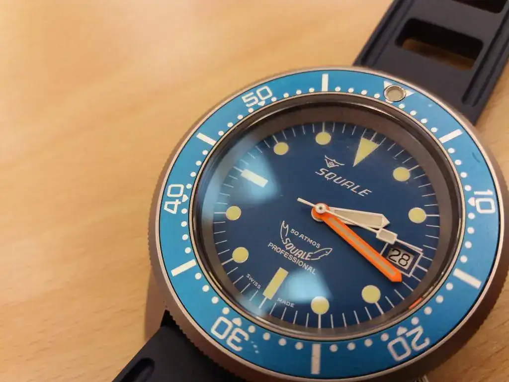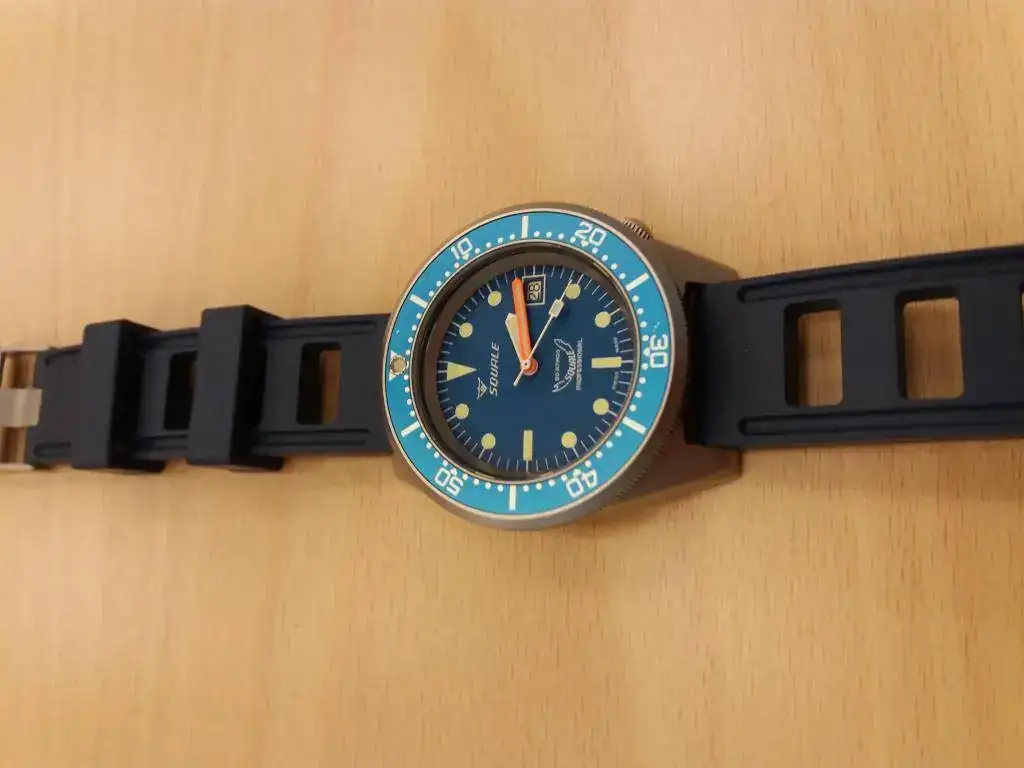 Hola compañeros, saco para venta este Squale 50 atmos azul, en muy buen estado pero con 3 marcas en el insert del bisel: a las 12 y las 6 dos arañazos leves pero que se ven y a las 2 un golpe que no ha levantado el azul del insert pero que también puede apreciarse. Va con su correa de piel original y usada y 2 cauchos Obris Morgan, azul y naranja, recién estrenados.