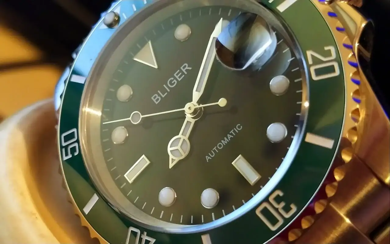 Hace unos dias recibí un muy humilde Bliger Hulk, de esa marca que tiene como madre Parnis y hermanos a Corgeut, Debert, etc. Y aunque a priori no esperaba nada para tirar cohetes la verdad es que me ha sorprendido para bien, muy bien. El bisel está alineado y tiene un tacto muy bueno. Mucho mejor que el bisel duro y a trompicones de mi desalineado Steeldive Willard. La caja está cuidadosamente cepillada, el lumen es algo flojo y ahi el steeldive le gana por goleada, pero el cierre le da mil vueltas al pagani y Steeldive. Es un sistema igual al del pagani Daytona pero hecho en serio y no como para los cliks de famobil. Con extension de buceo y todo, que cracks...