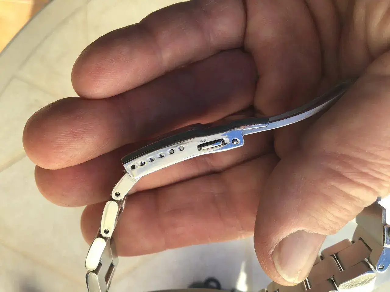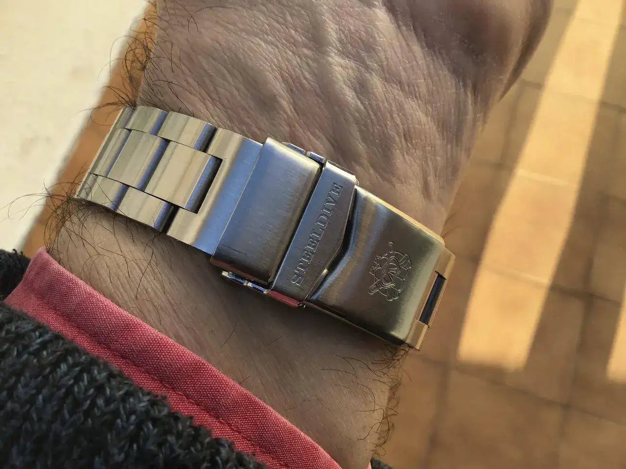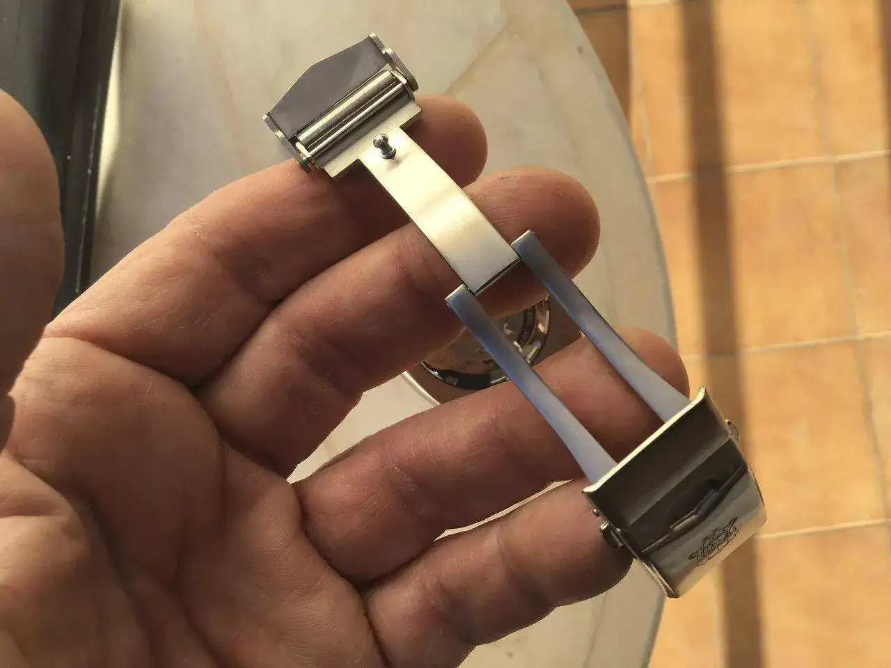 Los edn link son piezas macizas, pero van unidos por los pins que sujetan el brazalete al reloj, por lo que al ponerlo y quitarlo y también de la forma en que se manipule el reloj hay que tener mucho cuidado en no rayar el pequeño eslabón de unión entre el brazalete y los end links. A mí se me rayó algo al quitarle el brazalete para probar la correa de caucho. Posiblemente se puede disimular con un estropajo Scotch y con mucho cuidado, pero después seguro que se vuelve a crear esta marca, tarde o temprano por mucho cuidado que se lleve. Para mí es uno de los fallos de este brazalete.