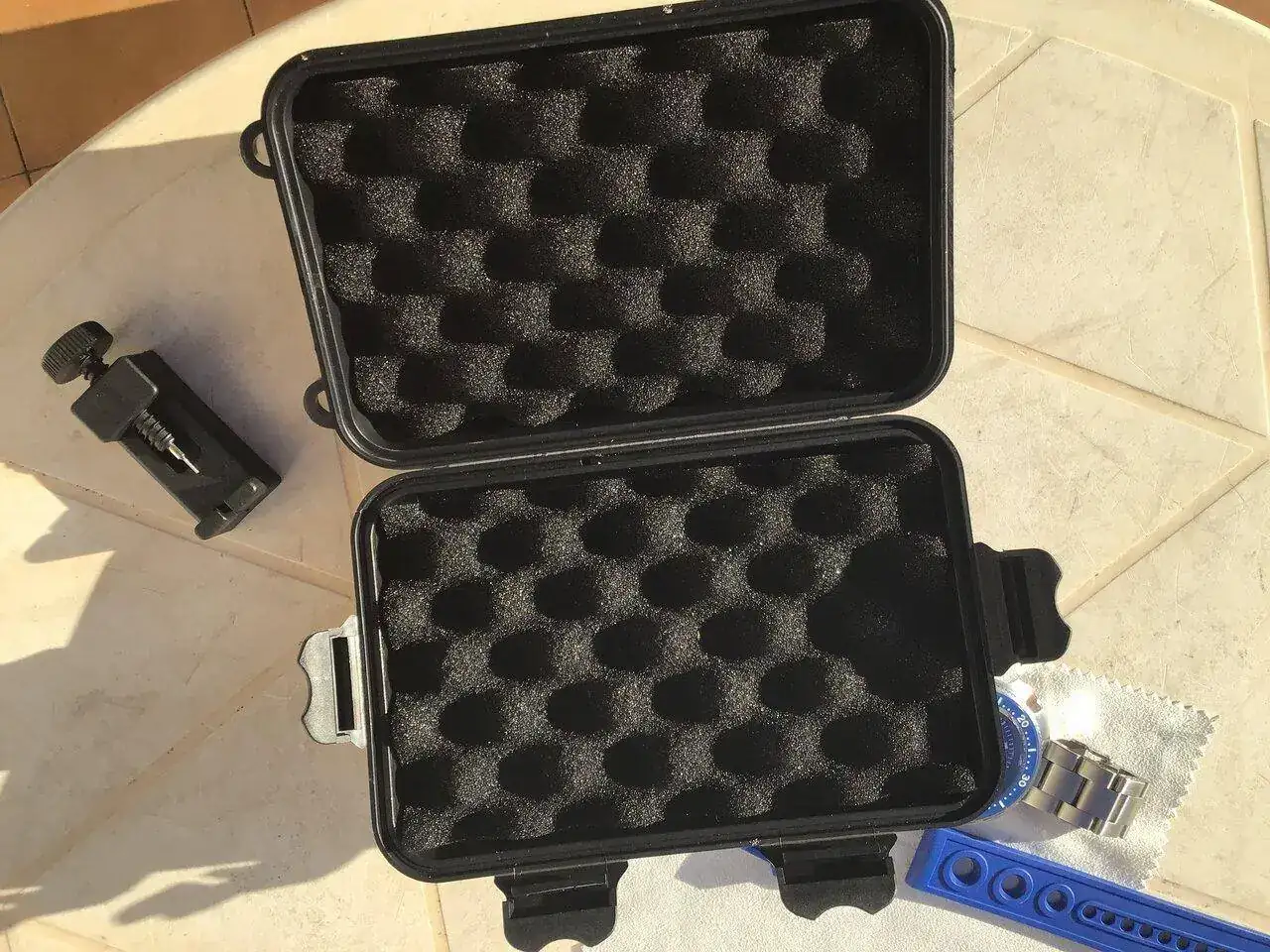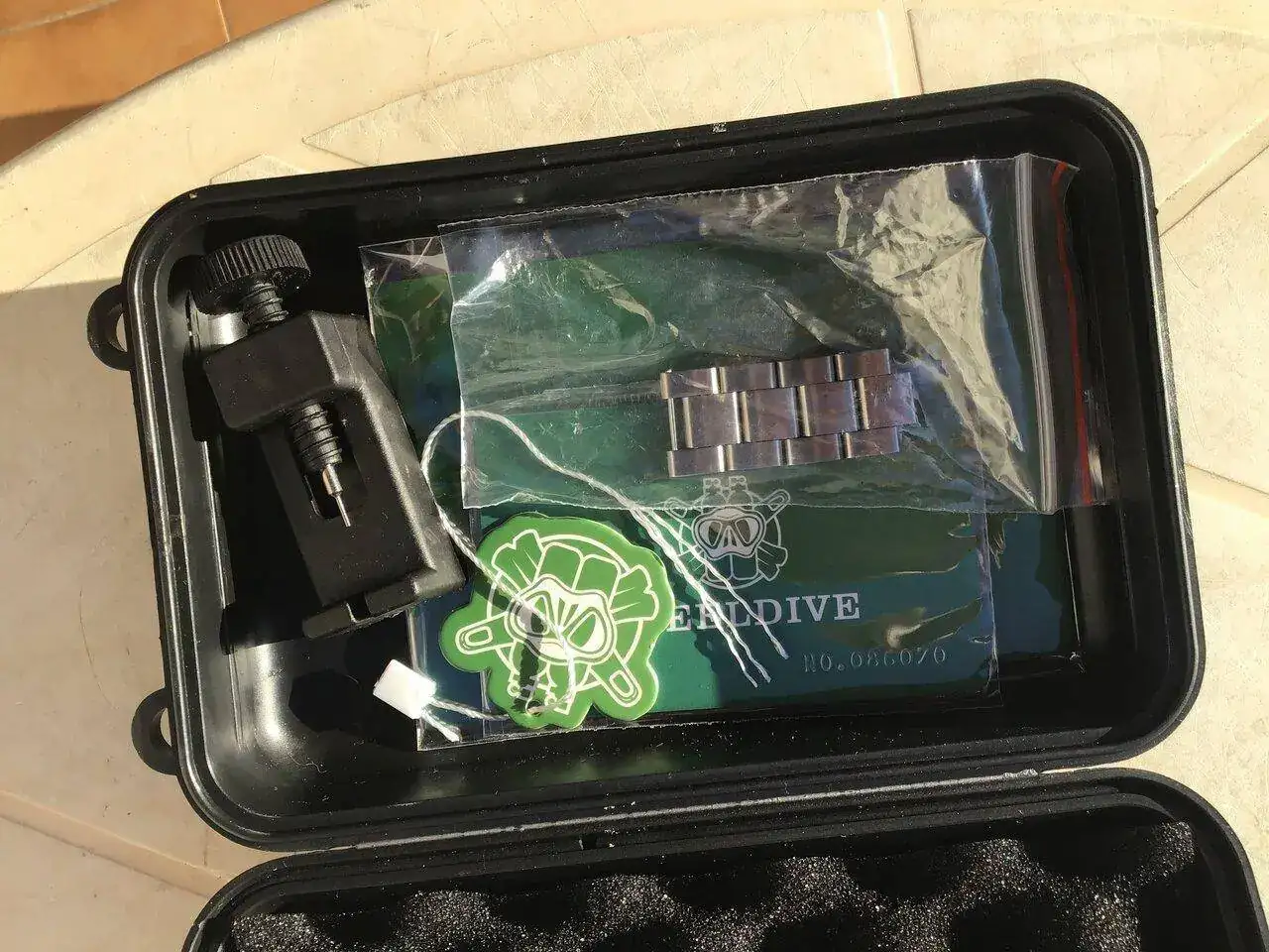La caja en la que viene, es de plástico con goma espuma y, no está mal. También viene con su garantía y librito de instrucciones y he utilizado la bolsita en la que venía la herramienta para extaer eslabones para guardar los eslabones sobrantes.