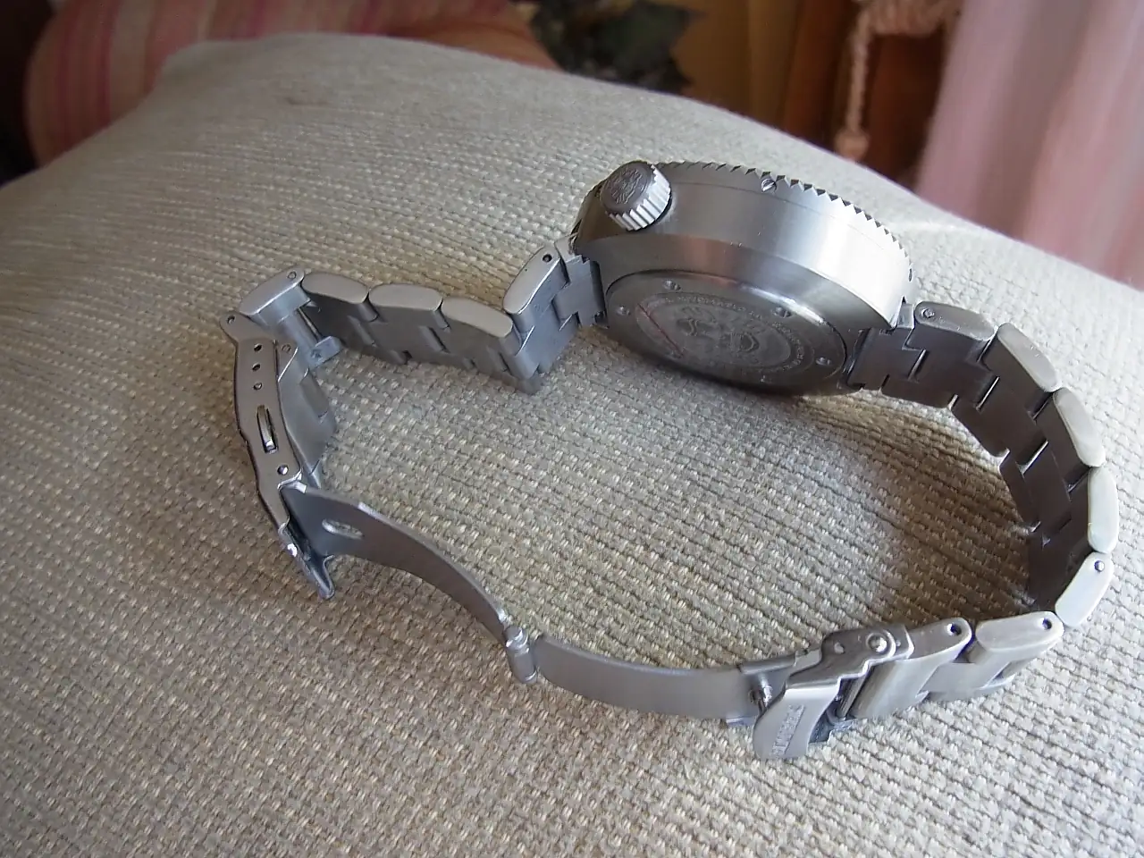-- Carrura y armis de acero inoxidable cepillado 316L.Cristal zafiro antirreflejos. Corona y fondo a rosca, grabados con el logo de la marca. W. R. 300 metros.