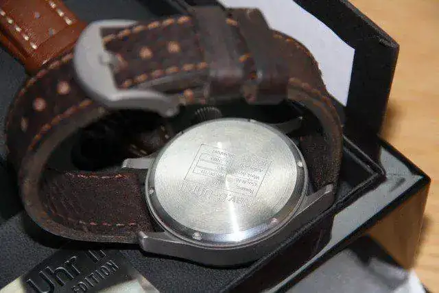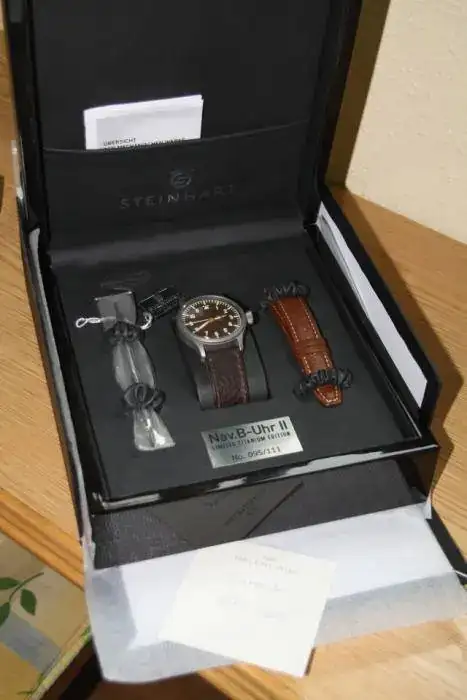 El set viene con una preciosa caja lacada y la exterior de cartón, así como los papeles. Va con su correa original Steinhart marrón, un útil para cambiar las correas, hebilla en titanio firmada, y le añado otra marrón más clara con pespuntes blancos, de la marca Alpha.