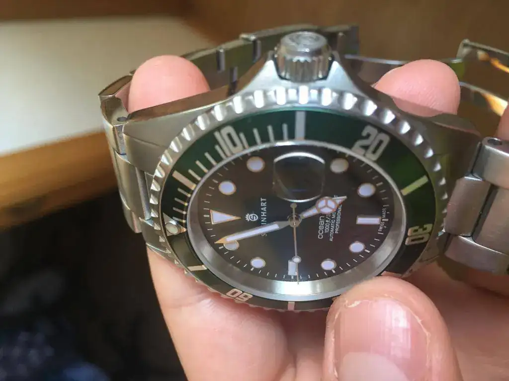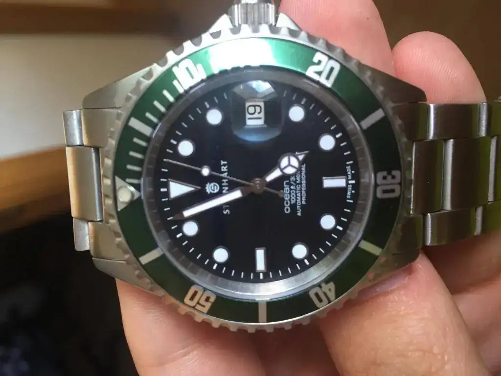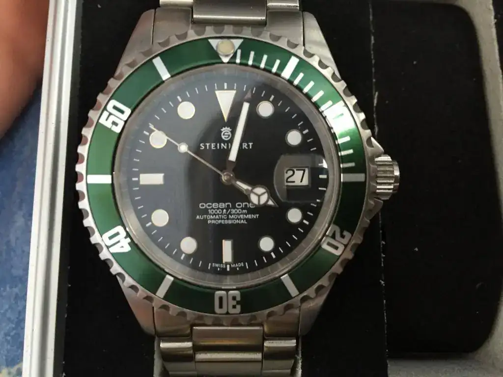 Se trata de un Steinhart Ocean One con bisel verde y dial negro.