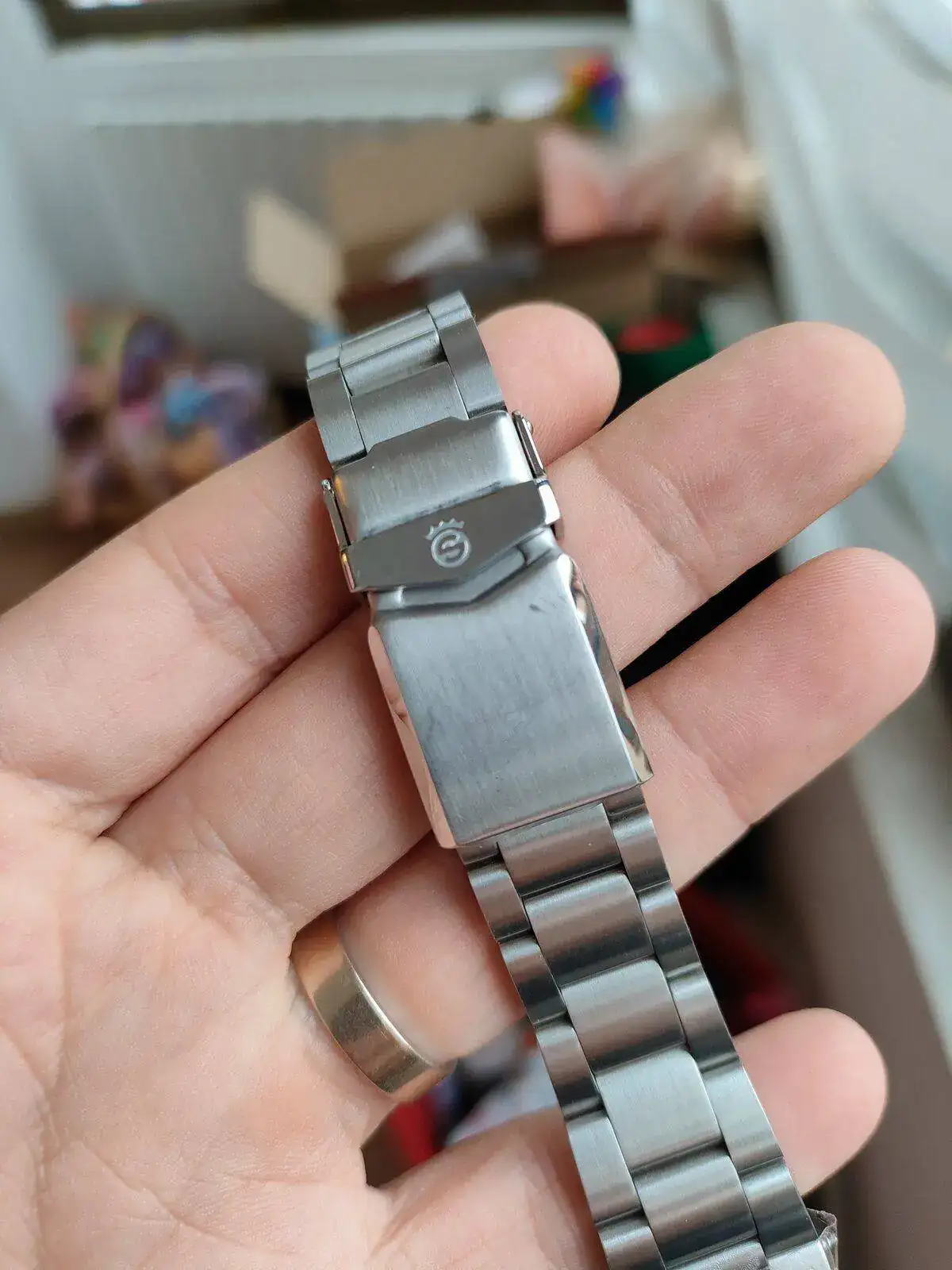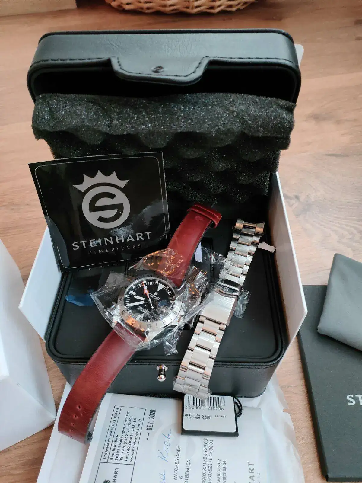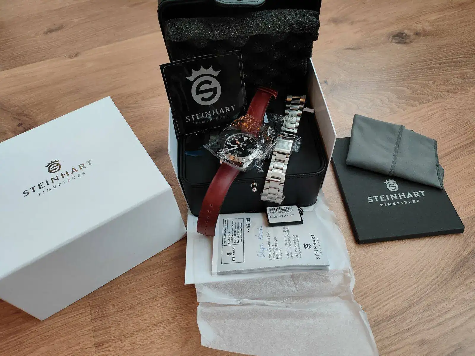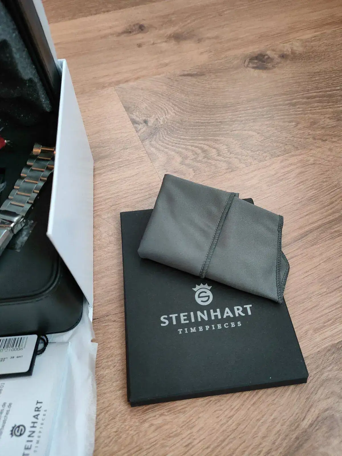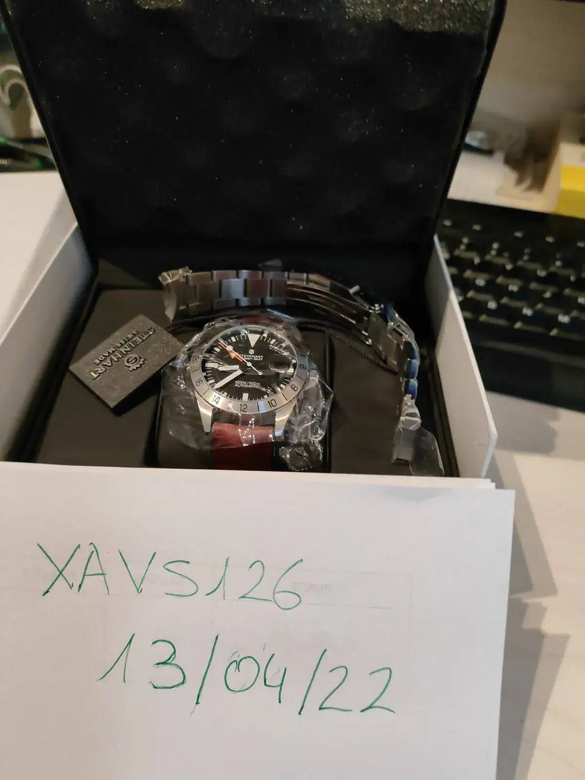 El reloj no defrauda y es cierto lo que se dice de los acabados de Steinhart. Dan mucho por lo que cuestan. La calidad del brazalete y su mecanizado son excelentes. Pulidos de la caja, agujas, lumen... todo muy muy bien. El reloj esta perfecto, casi diría de reestreno si no fuera por algún pelillo en el cierre (no he logrado sacarlo en las fotos pero ahí hay un par). Caja del reloj y cristal impolutos. Está todo perfecto. Va con su set completo: sobrecaja, caja, etiquetas, paño microfibra de la marca... está tal y cómo lo recibí.