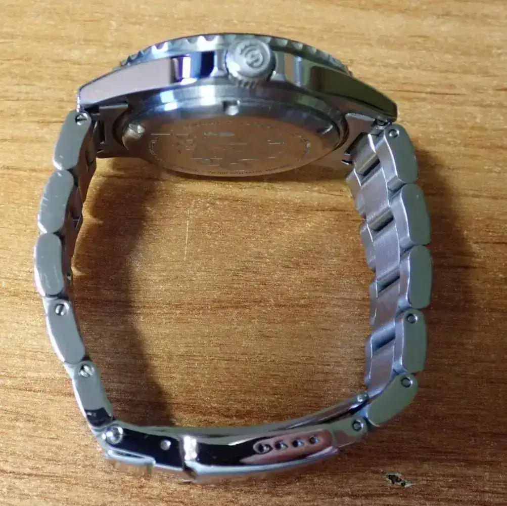Hago muchas fotos porque quiero que veáis lo bien que está el reloj, es lo que veis y no hay nada más, no se puede decir que sea "reestreno" ni nada por el estilo: es un reloj usado. Pero un reloj usado en el estado del que dan fe las fotos Ha tenido poco uso y bastante cuidadoso; los mínimos signos de uso aparece muy magnificados por las fotos, hechas en macro. En algunas fotos, si os fijáis, no son ni siquiera marcas, sólo polvo. Donde más se notan los signos de uso es en el cierre, que como sabéis ya se marca sólo por el roce encima de una mesa.