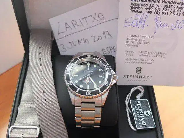 Va con su caja exterior ,su estuche .una correa nato y su librito sellado con garantia del año 2010 y va una cajita con 2 tornillos de los eslabones sobrantes que también van.