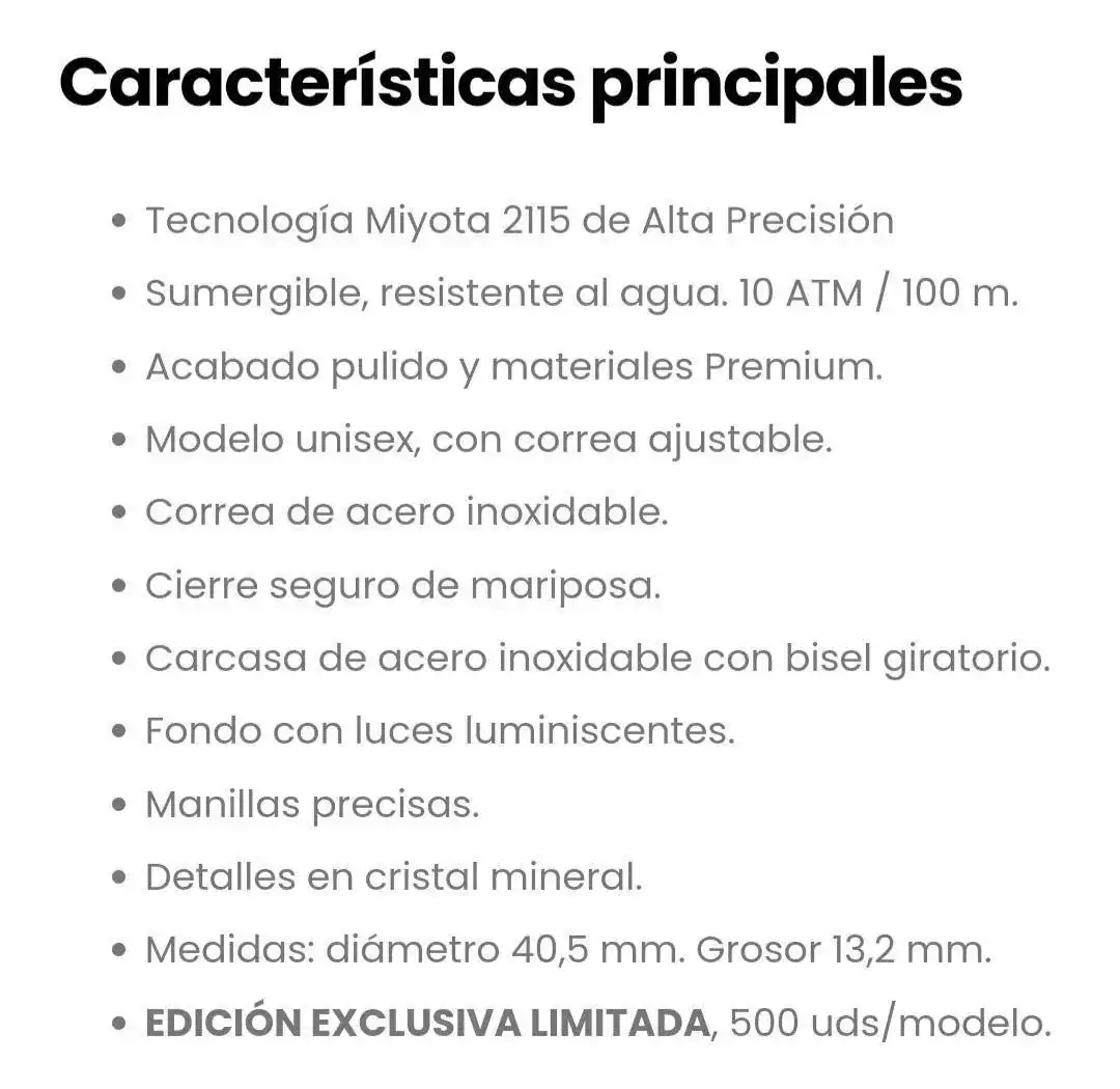 Todos ellos de estética Diver, aunque si se leen sus prestaciones se puede comprobar que no lo son: No se indica si la corona es roscada, no tiene referencia luminiscente en el bisel, resistencia al agua de tan solo 10atm...