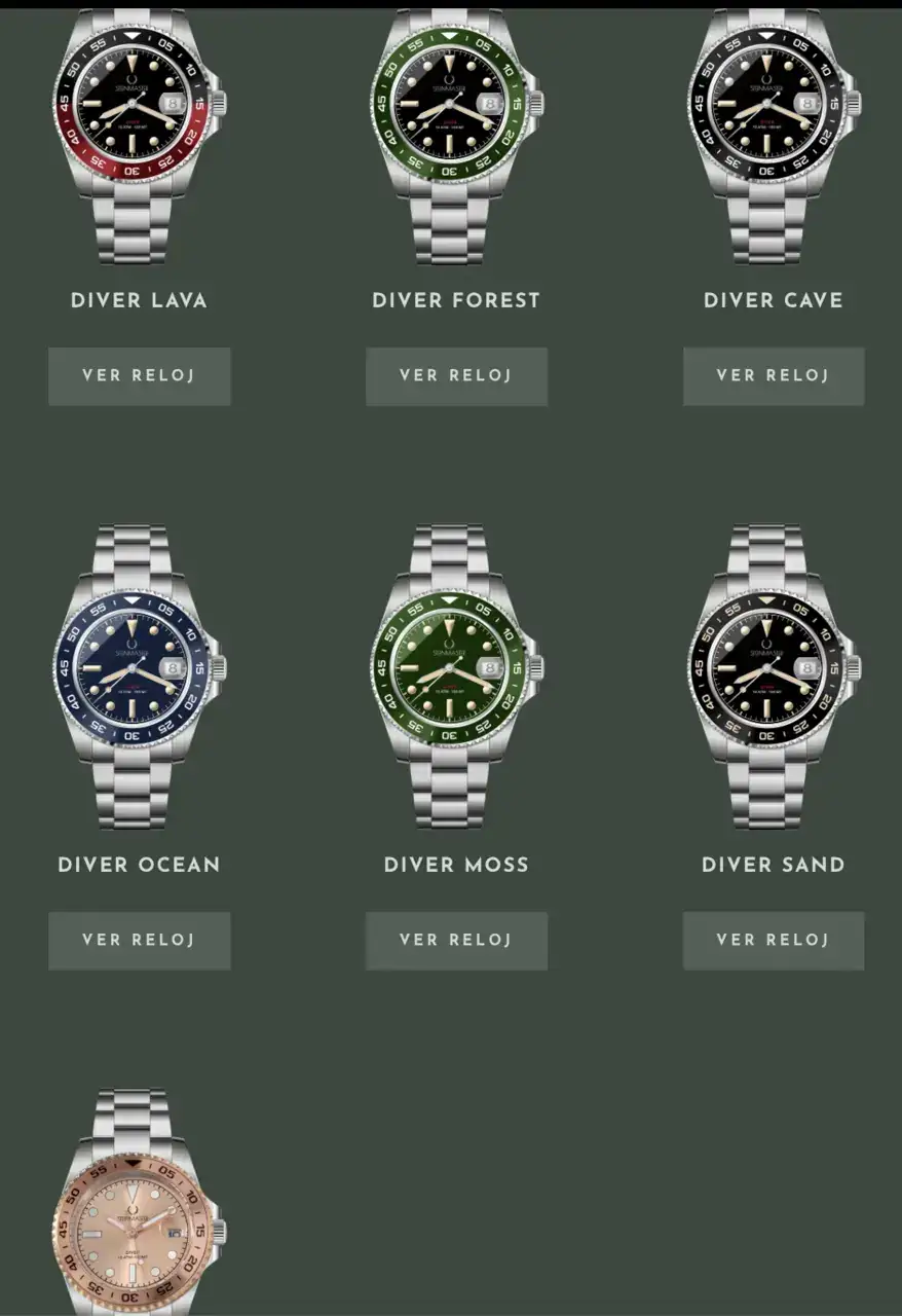 Resalto lo de los relojes honestos y asequibles porque cuando entramos a ver su catálogo, vemos que tiene siete variaciones de color de un único modelo que recuerda bastante a algún modelo de Rolex.