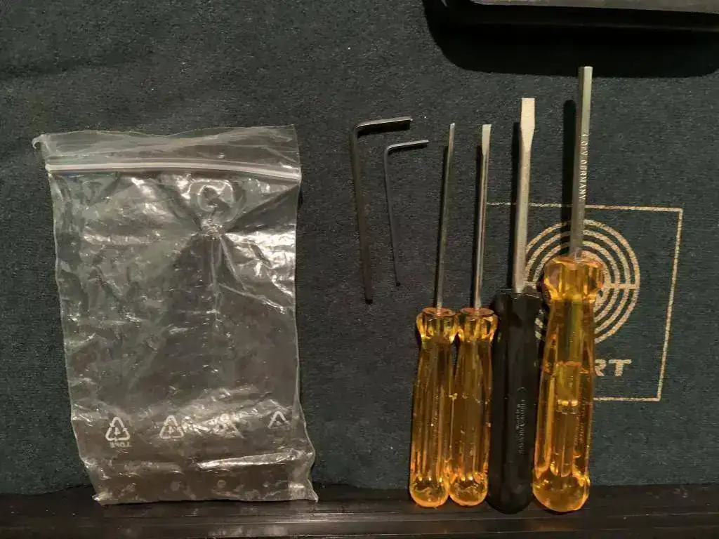 lleva todas sus herramientas(destornilladores y llaves allen), sus 4 contrapesos, cargador de 1 tiro y otro de 5 tiros.