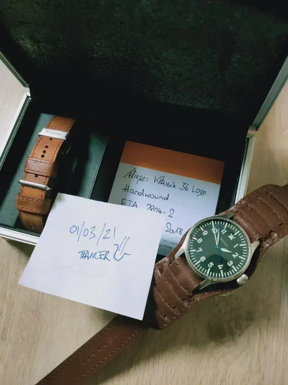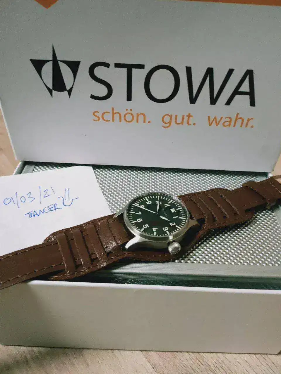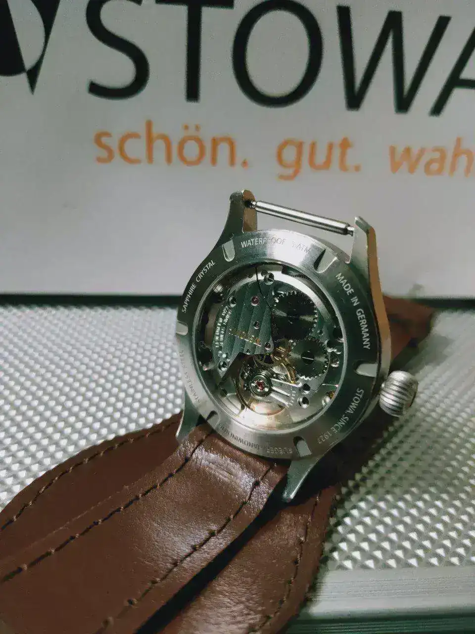 automatic: ETA 2824-2, hand wound: ETA 2804-2 or Sellita SW215-1 with Code Geneva, with blued screws, golden STOWA engraving. From now on we deliver most of the handwound watches with Sellita movements - more information in the FAQ's under "Quality of our movements" and "Sellita"