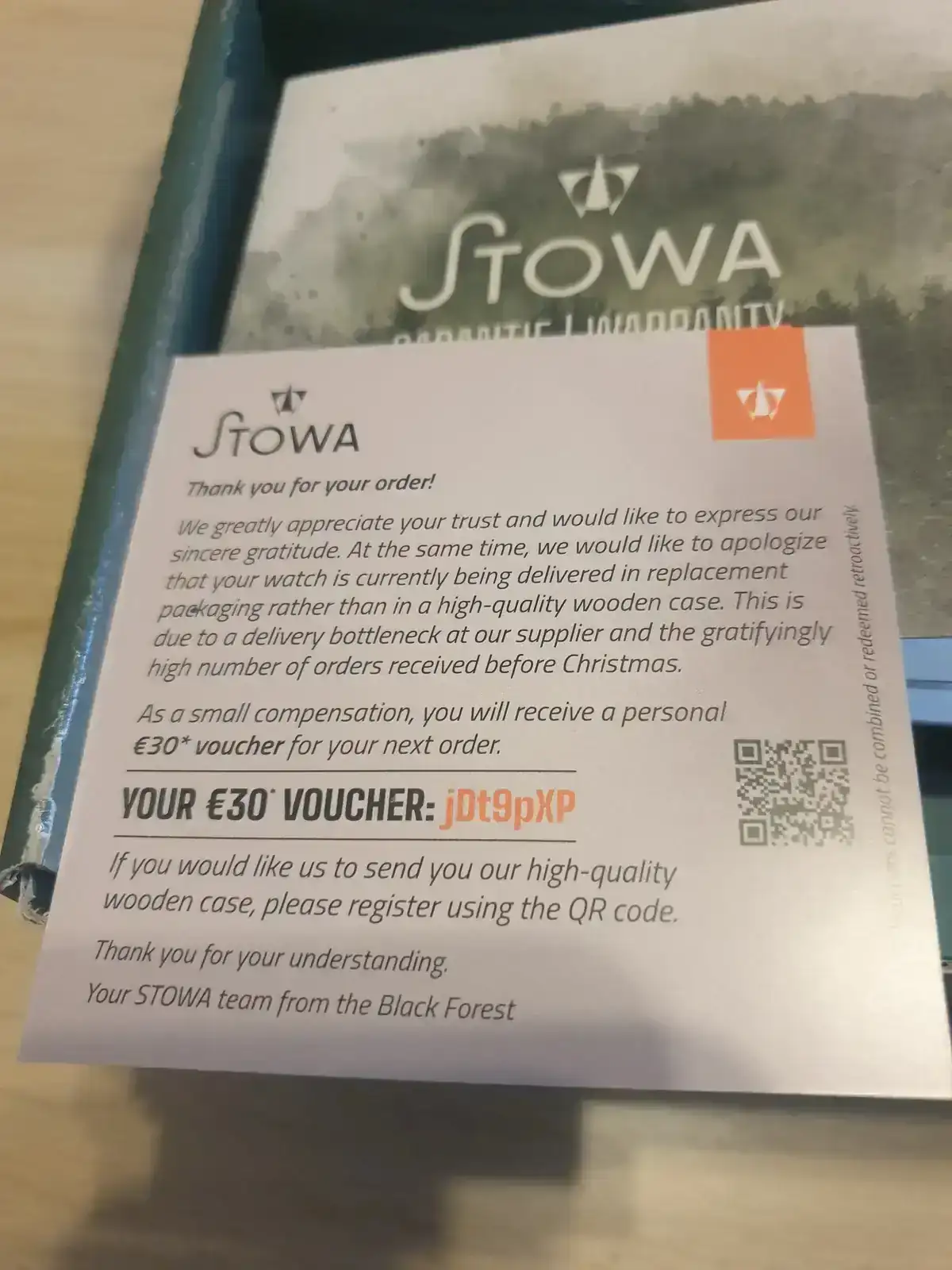 En compensación por ello me han adjuntado este código que es un descuento de 30 eurillos en cualquiera de sus productos y además si quiero recibir la caja cuando dispongan de nuevo de ellas escaneando ese QR te registras para ello. Lógicamente ya lo hice, cuando puedan me la enviarán.