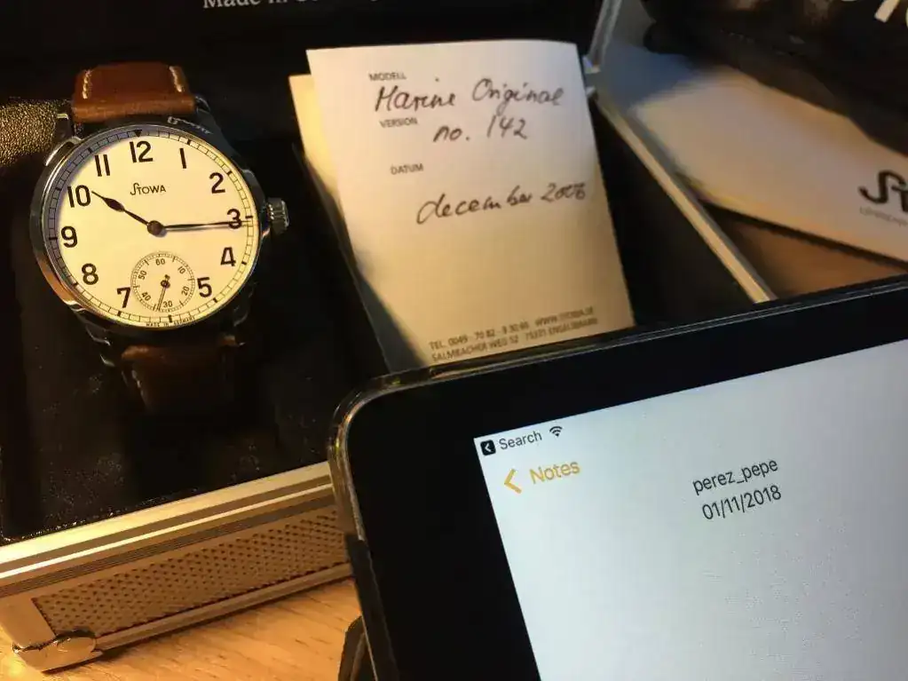 Pues finalmente me he decidido a vender un reloj en el foro, es mi primera venta, y no será la última, quiero dar salida a aquellos relojes que no uso apenas, me da pena tanto dejarlo en la caja como venderlo, pero es que me lo habré puesto si acaso 2 veces en lo que va de año. En este caso saco a la venta, sólo venta, NO quiero cambios, este Stowa Marine Original, comprado por mi en 2006, está en un estado fantástico 8/9 de 10, los típicos pelillos que en foto se ven muy magnificados y nada más, ningún golpe en la caja o cristal.