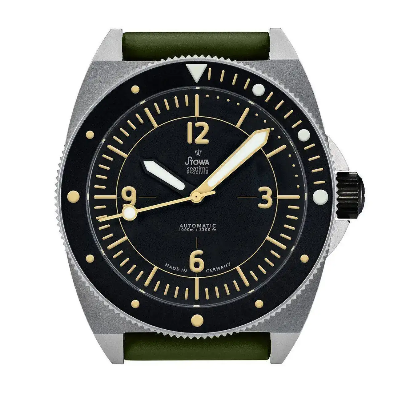 La esfera negra mate tiene números, marcadores y manecillas cubiertos con Old Radium SuperLuminova.