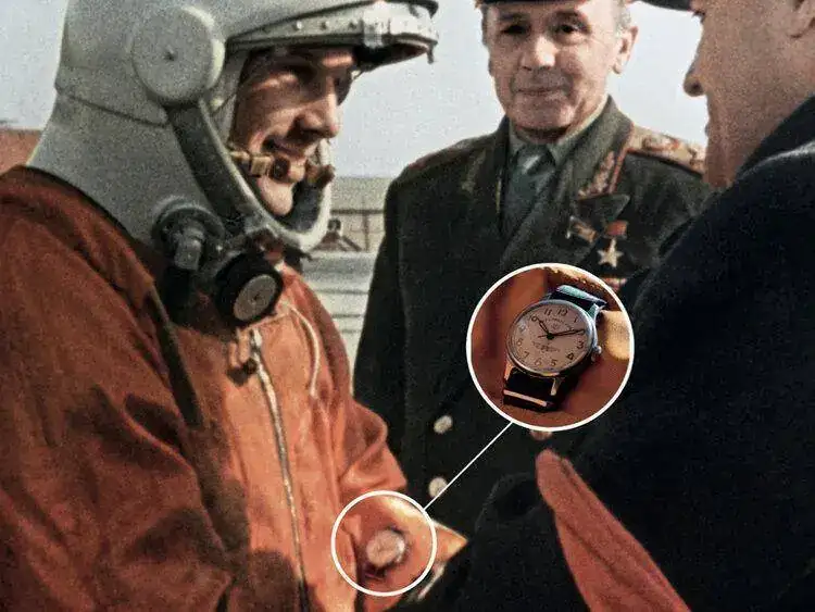 La famosa foto de Gagarin con el Sturmanskie en el antebrazo: