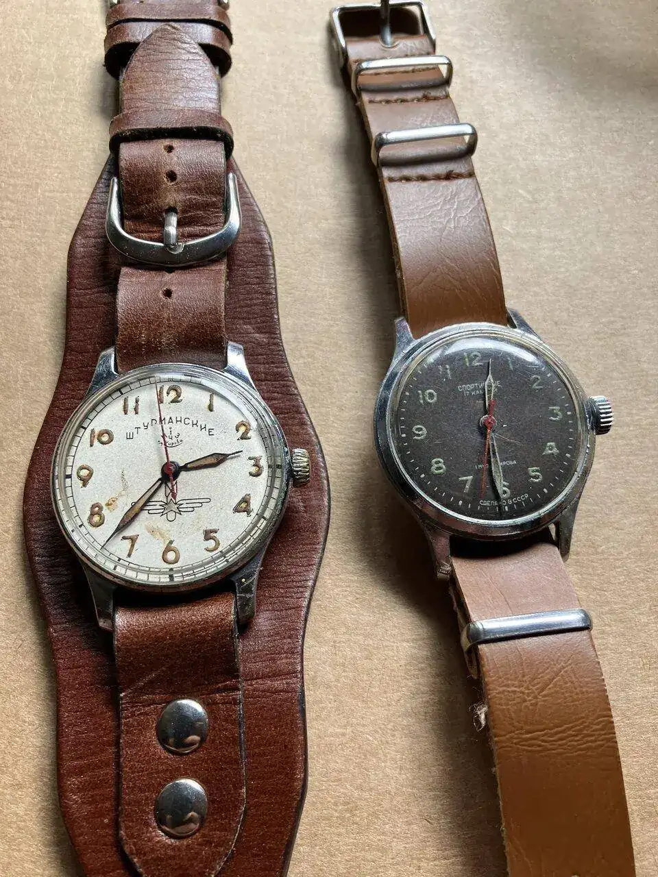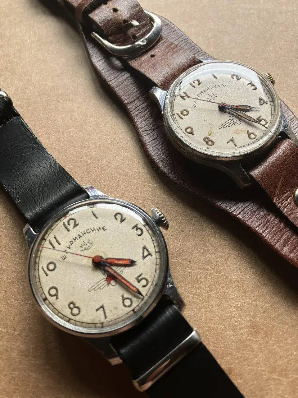 Ese proceso de modernización se vió truncado por la Segunda Guerra Mundial. Tanto Alemania como la Unión Soviética sufrieron enormes pérdidas humanas y materiales. En la URSS, sin embargo, ya desde el mismo fin de la guerra, las autoridades decidieron apostar por continuar la modernización, probablemente porque la industria relojera había sido una de las que más fácilmente se había reconvertido en industria de armamento. En ese clima de dificultades económicas y de reconstrucción, surge la necesidad de que la industria relojera proporcione un reloj a los pilotos de la fuerza aérea adaptado a los tiempos modernos. Por supuesto, el estado de la industria soviética no permitía afrontar un proyecto para diseñar y fabricar algo como el fantástico B-uhr de la Luftwaffe. Así que a partir del movimiento K26, un diseño soviético inspirado en el Lip R26, se creó una versión de segundero central. En su uso militar, a este movimiento se le añadió la parada de segundero mediante un resorte. Así nació en 1949 el primer Sturmanskie, con movimiento de 15 rubís. En la foto podéis ver los dos modelos: