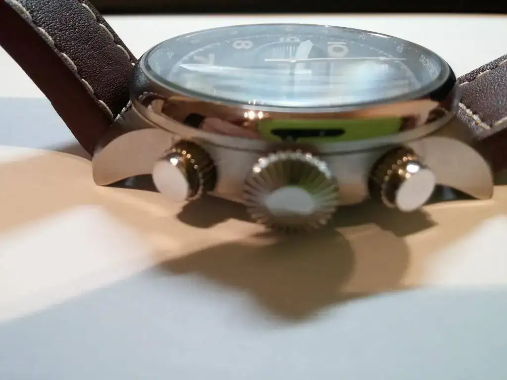 Aclarar también que el reloj no tiene segundero y que la aguja para tal efecto es la del crono.