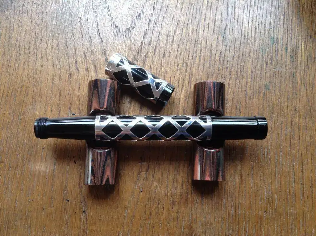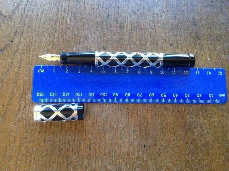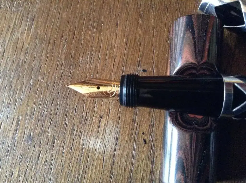 Se trata, pues, de una pluma de resina con overlay de plata, plumín de 18 k #5 en punto medio y el mecanismo interior, eso sí, de ebonita.