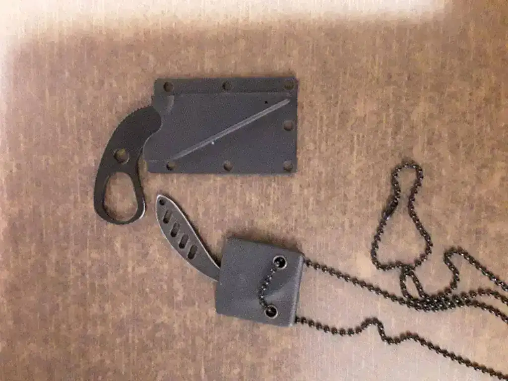 Bueno, mas que colaboración (de mi hijo), los hemos hecho mano a mano, partiendo de dos trozos de acero oxidado que tenia en el garaje, cortarlos, perfilarlos, templarlos, pulirlos y afilarlos. Las empuñaduras una la hemos hecho con cuerda de paracaídas y la otra con un trozo de cerezo. Y los mismo con la fundas a partir de un recorte me regalo un amigo guarnicionero.