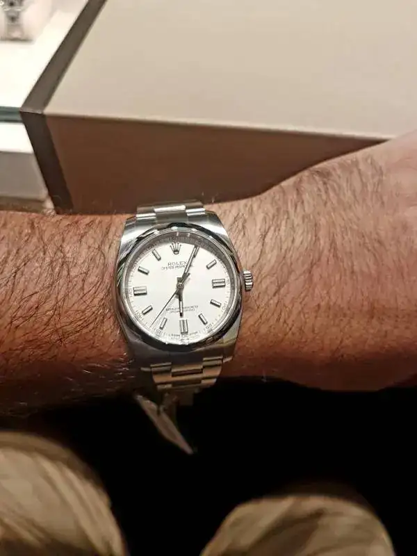 Como dices que lo prefieres sin fecha, échale un ojo al nuevo op de 36mm. La esfera a mi encanta,es un "blanco roto",que lo hace más discreto que el blanco o plateado que son brillantes. Lo que ya no sé es si tiene la opción del jubilee.